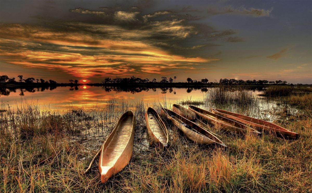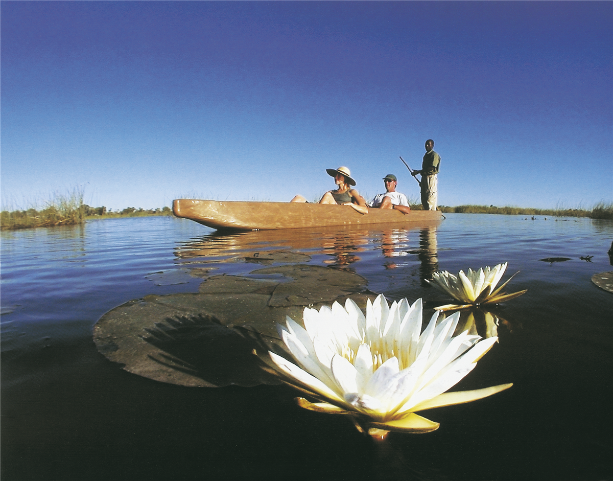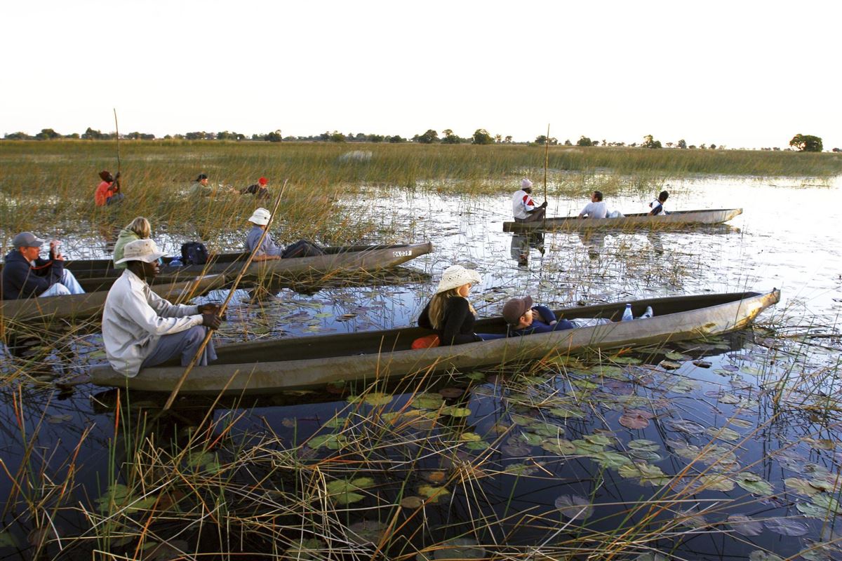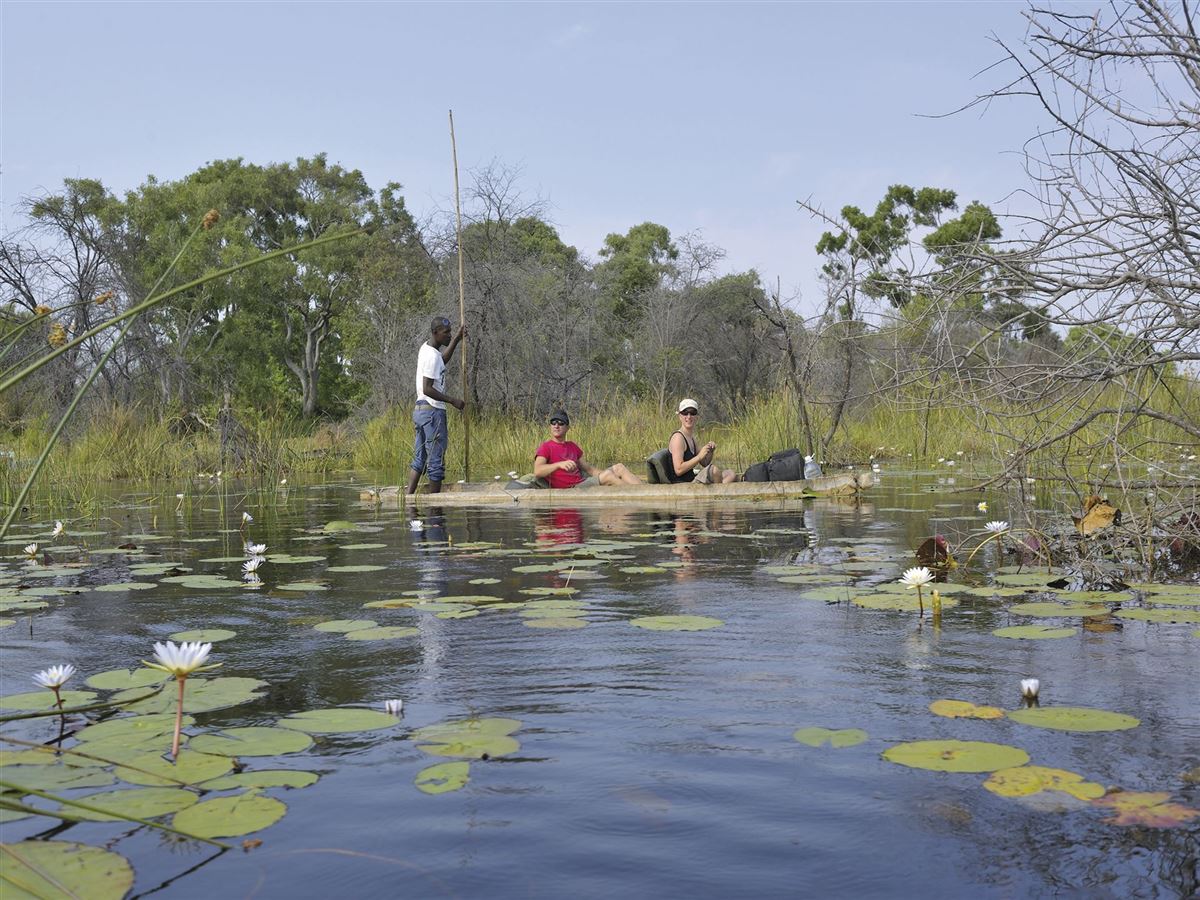 Fahrt zur Ablegestelle (ca. 2 Std.). Einheimische Führer staken uns in traditionellen Mokoros (Einbaum-Flachboote) tief in das Herz des Deltas, das größte Binnendelta der Erde - mittendrin, irgendwo auf einer kleinen Insel, zwei Zeltübernachtungen (chem. Buschtoilette pro Zelt, ein gemeinschaftliches Duschzelt).