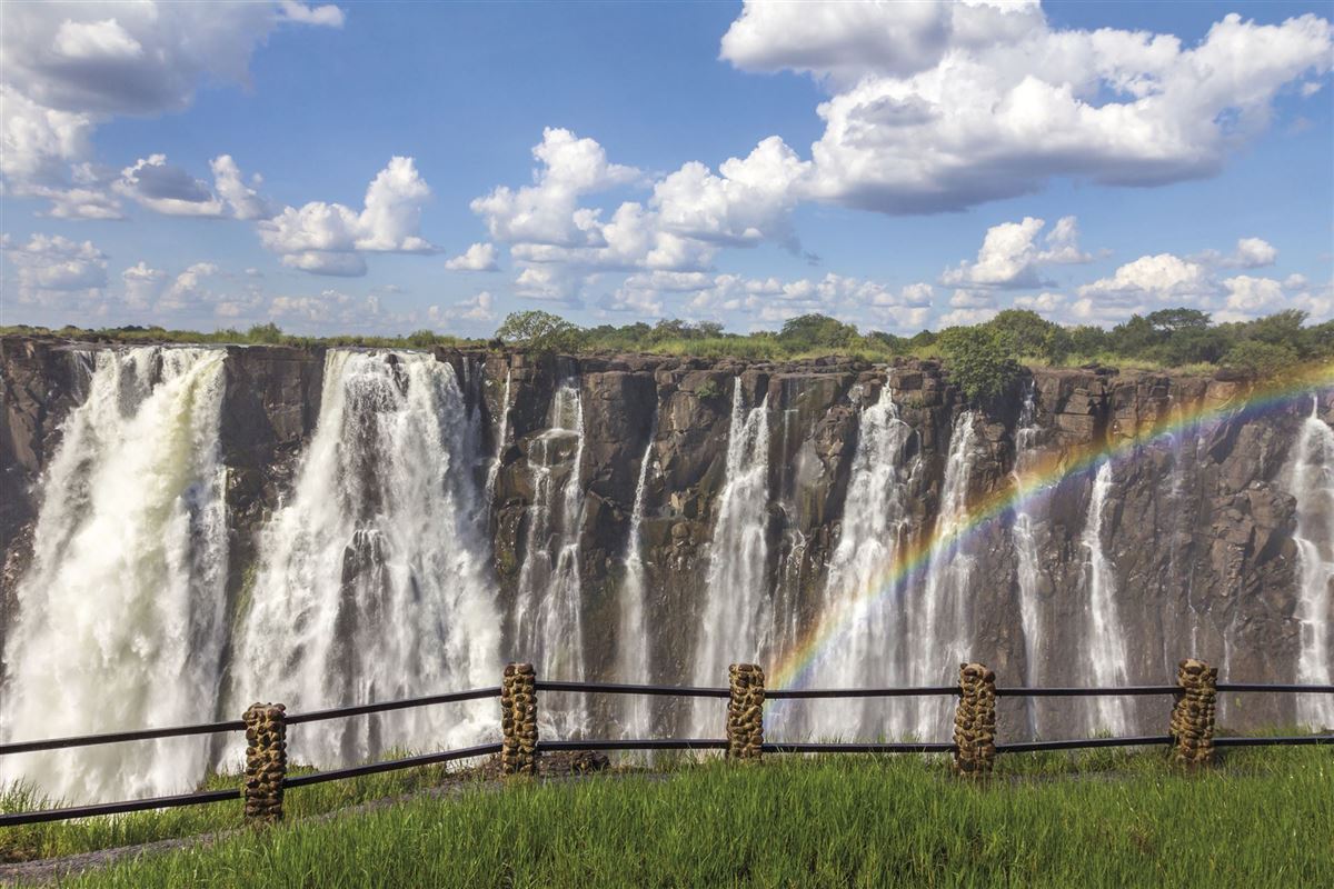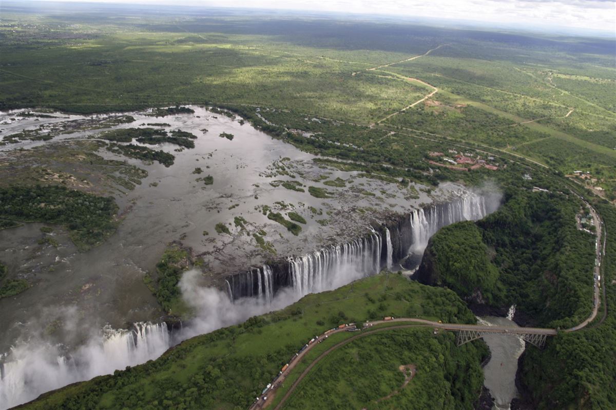 An der Grenze zwischen Simbabwe und Sambia fließt der Sambesi der zwischen den Städten Victoria Falls und Livingstone auf einer Breite von fast 2 Kilometern rund 120 m in die Tiefe stürzt. Die Ureinwohner nennen den größten Wasserfall Afrikas auch „Donnernder Rauch“, wegen dem Sprühnebel der bis in eine Höhe von 300m aufsteigt und den man noch in 30 km Entfernung sehen kann. Den Namen verdanken die Wasserfälle ihrem schottischen Entdecker David Livingstone, er war der erste Europäer der das sagenhafte Wunderwerk der Natur zu Gesicht bekam. Beim Anblick der majestätischen Fälle gab er ihnen den Namen „Viktoriafälle“, zu Ehren der britischen Königin Viktoria. Der angrenzende Regenwald verdankt eben diesem Sprühnebel seine Existenz, der ihn fortwährend mit Feuchtigkeit versorgt. In Dürrejahren kommt es allerdings immer wieder vor, dass von den tosenden Wassermassen der Wasserfälle oft nur ein kleines Rinnsal übrig bleibt. Beste Reisezeit ist deshalb von März bis Mai, während der Regenzeit, denn dann führen die Kaskaden das meiste Wasser, die dichte Gischt steigt am höchsten und auch das Farbenspiel von Himmel, Wasser und Nebel ist dann am intensivsten, am Morgen und am Abend färbt die Sonne nämlich das gesamte Gebiet rosa und orange. Wer den ganz besonderen Nervenkitzel sucht, kann diesen am Fuß der Fälle erleben, hier wird Rafting angeboten. Jeder der so viel Wagemut besitzt kann später von sich behaupten am größten einheitlich herabstürzenden Wasserfall der Welt geraftet zu haben. 1934 wurde der grenzüberschreitende Mosi-oa-Tunya-Nationalpark zum Schutz der Viktoriafälle und ihrer Umgebung errichtet und seit 1972 ist er auch als solcher offiziell ausgeschrieben. 17 Jahre später wurde „der größte Wasservorhang der Welt“ dann auch unter den Schutz der UNESCO gestellt und zum Weltnaturerbe erklärt.