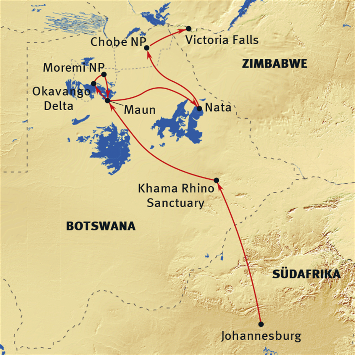 Okavango-DeltaBotswana fasziniert mit unberührten Landschaften, üppiger Natur, beeindruckendem Tierreichtum und Menschenleere. Unsere Reise im Expeditionsstil erkundet das Khama Rhino Sanctuary und das Okavango-Delta, mit Übernachtungen in rustikalen Chalets, Zelten oder Gemeinschaftsunterkünften. Unter Anleitung eines erfahrenen Fieldguides erleben wir Flora und Fauna hautnah, bereiten Mahlzeiten gemeinsam zu und reisen mit leichtem Gepäck. Kleine Gruppen von maximal 12 Teilnehmern gewährleisten ein intensives Naturerlebnis