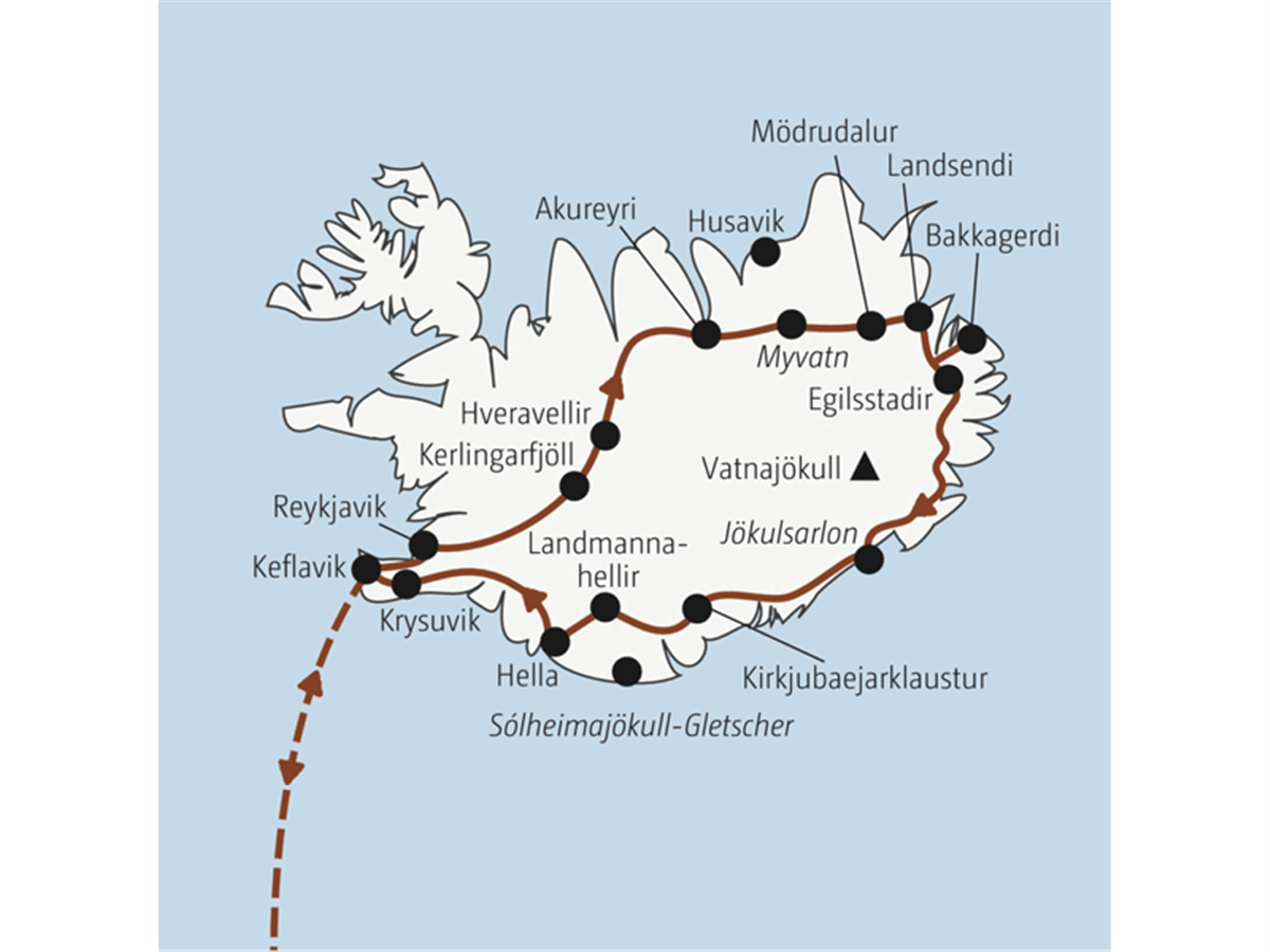 Zum Abschluss noch ein letztes Highlight: die geologisch aktive Halbinsel Reykjanes. Wir stoppen am dampfenden Geothermalgebiet Krysuvik, besuchen das Fischerdorf Grindavik und bestaunen die steilen Klippen von Reykjanestá mit dem brodelnden Gunnuhver nebenan (Programmanpassungen aufgrund aktueller vulkanischer Aktivitäten jederzeit möglich). Am späten Nachmittag bringt uns der Bus ins nahe Keflavik. Beim gemeinsamen Dinner heißt es: Goodbye, Iceland! Wir kommen bestimmt wieder - vielleicht im Winter?! Die Reise endet gegen 22 Uhr am Flughafen Keflavik.