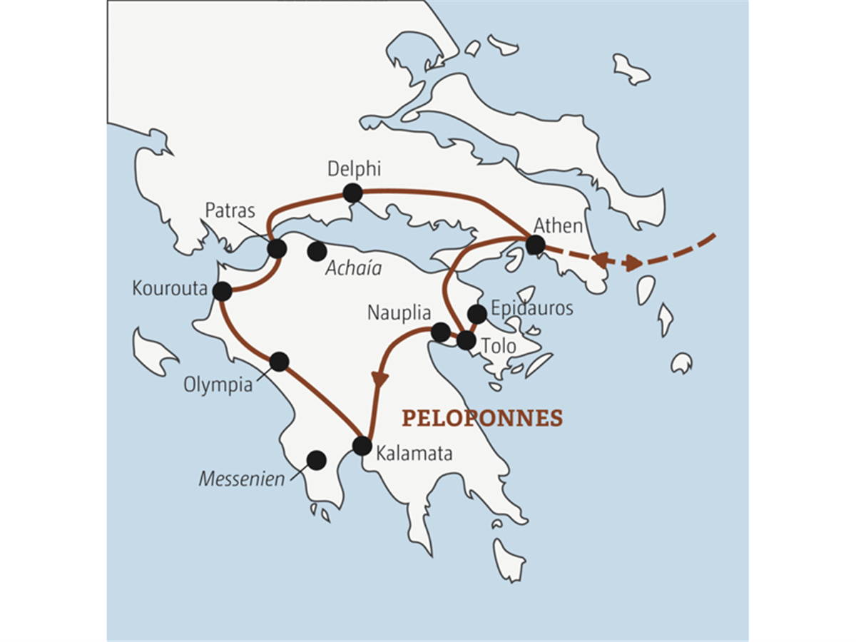 Vormittags starten wir einträchtig dahin, wo vor 3000 Jahren Athleten gegeneinander angetreten sind: Olympia. Unsere Trainerin macht uns fit in allen Fragen rund ums Stadion. Und schließlich wissen wir sogar, dass Demeter eine Göttin war und nicht nur der Name biologisch-dynamischer Landwirtschaftsbetriebe ist. Weiter bequem im Reisebus an der Küste entlang zum Badestopp am Kourouta-Strand. Im sanften Nachmittagslicht erreichen wir unser zentral gelegenes Hotel in Patras. Gegen die Kalorien vom Grill noch eine Runde Joggen an der Uferpromenade?