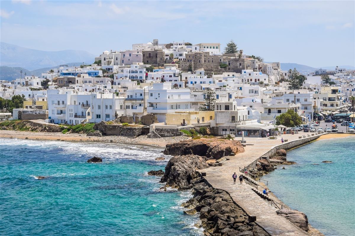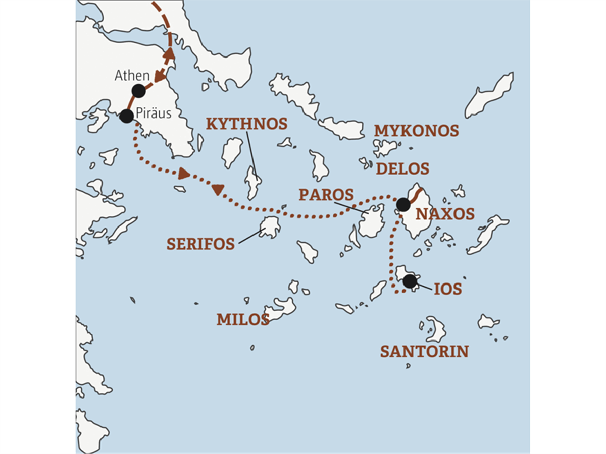 Der frühe Vogel fängt ... heute die erste Fähre am Hafen von Piräus. Wir machen es uns an Deck bequem und schauen erwartungsvoll auf die ersten vorbeiziehenden Inseln. Gegen Mittag erreichen wir die größte Insel der Kykladen, Naxos. Wie eine Schaumkrone treibt Naxos-Stadt im endlosen Blau vor uns. Das Gepäck fährt ohne uns ins Hotel – wir stürzen uns ins Leben am Hafen: die Promenade entlang, vorbei an kleinen Shops, dann durch die immer schmaler werdenden Gassen der Altstadt ... Und immer wieder sehen wir die Ägäis zwischen den weiß getünchten Häusern funkeln. Den Tag beschließen wir in einer Taverne mit frisch Gegrilltem, Bauernsalat & Co. Gestärkt zieht es die meisten von uns später auf die Einkaufsmeile Paralia: Livemusik, Sternenhimmel, griechische Lebensfreude ... Urlaubsfeeling pur!