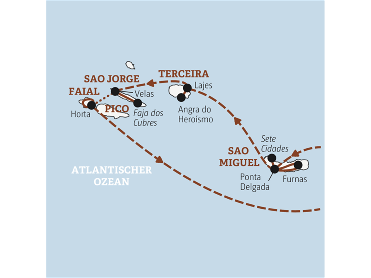 Morgens kurzer Hüpfer mit dem Flugzeug zur Nachbarinsel Terceira. Nach der Landung brechen wir gleich zu einer zweistündigen Küstenwanderung zu Vogelfelsen und Meeresbuchten auf. Weiter geht's ins vulkanische Innere der Insel: Bei den Furnas do Enxofre dampft es wieder schwefelig aus dem Erdinneren. Ein paar Kilometer weiter Stopp an der Höhle Algar do Carvao: Eine Treppe führt durch einen Vulkanschlot in die Tiefe ... Wie wäre es außerdem mit einem Bad in den Lavaschwimmbecken von Biscoitos? Spätnachmittags sind wir dann in Angra do Heroísmo, der ältesten Stadt der Azoren.