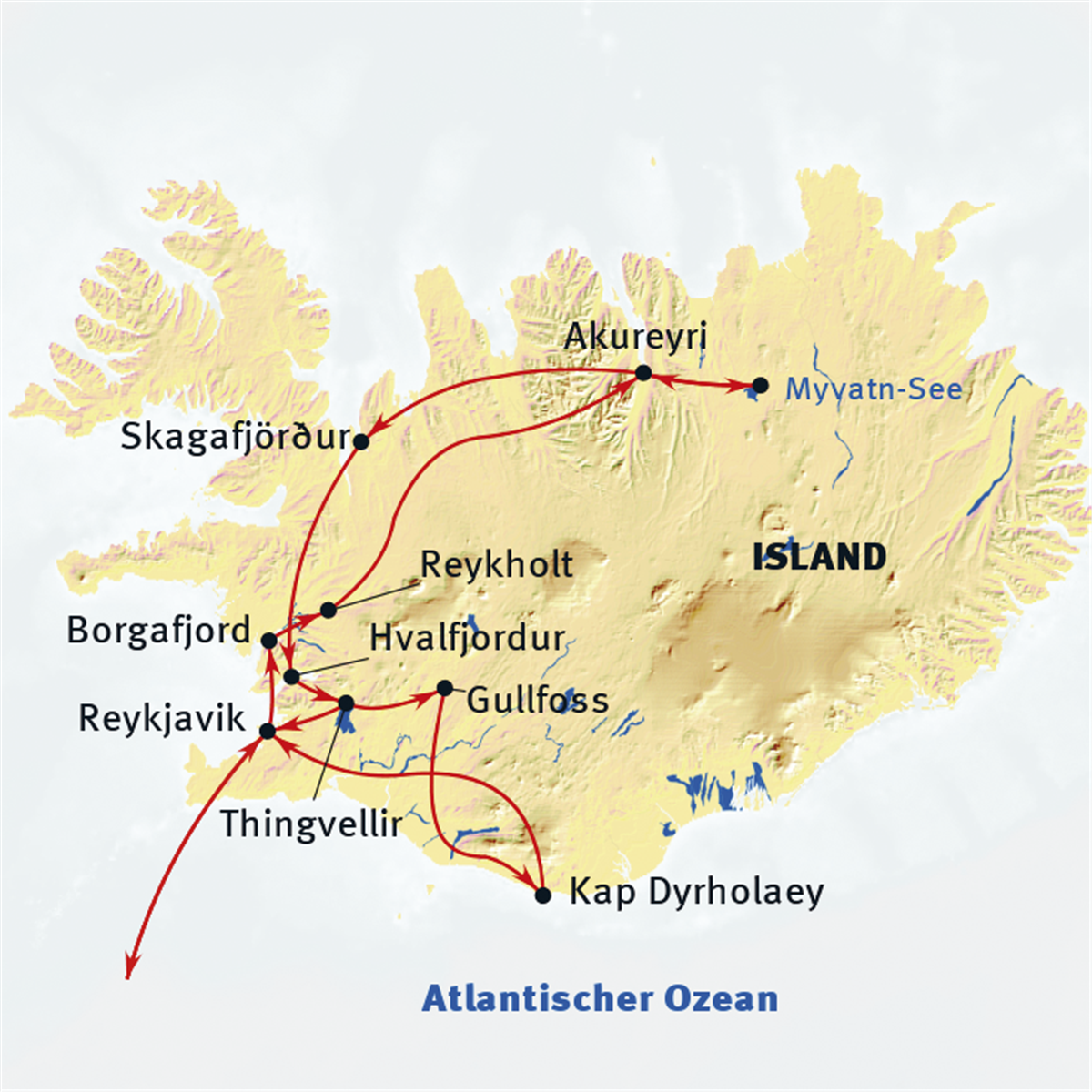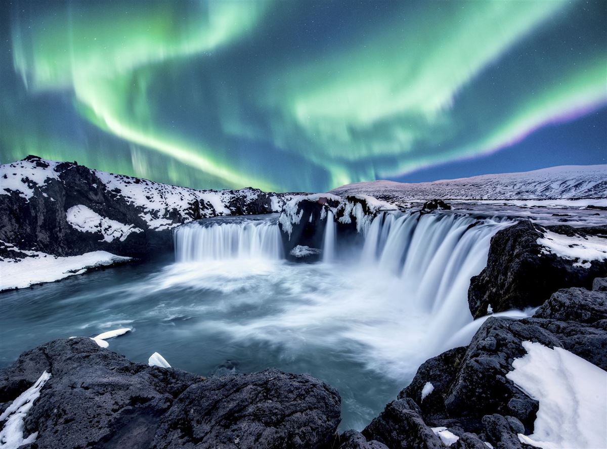 Auf dem Weg zu unserem Tagesziel, dem See Myvatn, liegt der Wasserfall Godafoss. Der Sage nach wurden nach der Annahme des Christentums die alten Götterbilder hier in den Wasserfall geworfen und zerstört. Im Myvatn-Gebiet treffen "Himmel und Hölle" aufeinander. Am Fuße des Berges Namafjall liegt das stark schwefelhaltige Solfatarengebiet Namaskard mit Erdspalten, aus denen stetig Dämpfe austreten, mit brodelnden Schlammtöpfen und Heißdampfquellen. Achtung: Nicht mit den Händen die Temperatur messen! Am Myvatn-See (dt. Mückensee), finden wir Pseudokrater, die nirgends sonst auf der Erde so schön zu sehen sind. Der größte Ringwallkrater Hverfjall und bizarre Lavaformationen gehören ebenso zum Erscheinungsbild, wie die eindrucksvollen schwarzen Lavaburgen von Dimmuborgir. Die „Dunklen Burgen“ sind die Überreste eines Lavasees, dessen Damm nach der teilweisen Erkaltung brach, so dass die bereits erstarrten Teile als bizarre Formationen zurückblieben. Je nach Witterungsverhältnissen begeben wir uns auf einen Spaziergang durch das Lavafeld. Am frühen Nachmittag können wir bei einem Bad im Myvatn Naturbad (Eintritt und Handtuch inkl.) entspannen. Ähnlich der Blauen Lagune, ist dieses Geothermalbad ebenfalls in die Lavalandschaft gebaut und hat wohlig-warmes, mineralhaltiges Wasser. BItte beachten Sie, dass von Januar bis März das Geothermalbad Forest Lagoon in Akureyri anstelle dem Myvatn Naturbad besucht wird!