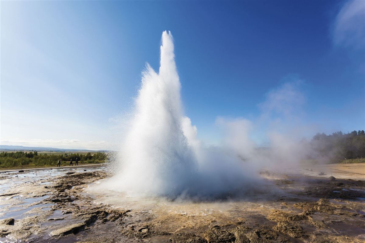 Fahrt über die Hochlandpiste Kjölur zwischen den Gletschern Langjökull und Hofsjökull hindurch. Unterwegs Badegelegenheit in einem natürlichen, warmen Becken. Die Hochlandstrecke endet im Süden am "goldenen" Wasserfall Gullfoss und im Hochtemperaturgebiet Haukadalur, wo sich der mächtige Geysir und sein kleinerer aktiverer Bruder Strokkur, befinden (Tagesdistanz ca. 290 km).