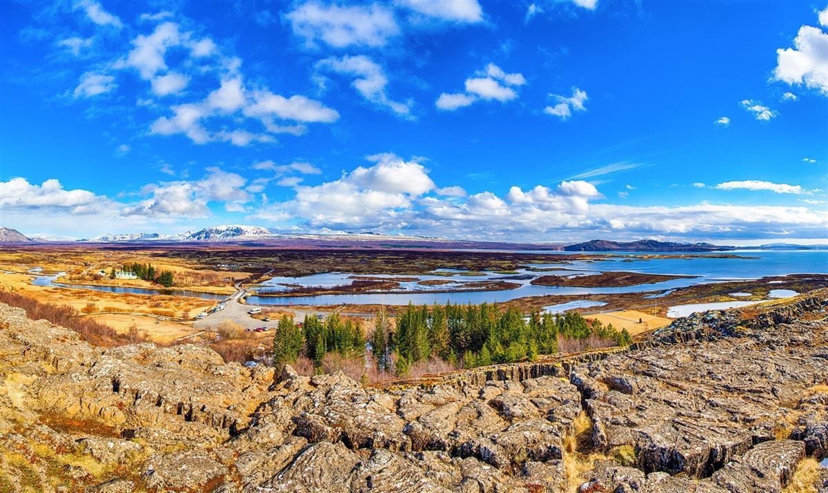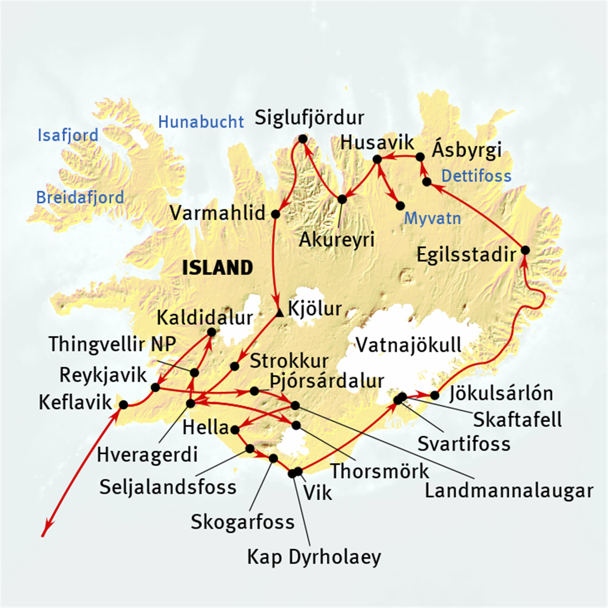 Entlang des Sees Thingvallavatn erreichen wir heute den Nationalpark Thingvellir, seit 2004 UNESCO-Weltkulturerbe. Hier wurde im Jahre 930 eines der ältesten Parlamente der Welt gegründet. Die Ebene ist ein geologisch sehr interessantes Gebiet: Island liegt auf dem Mittelatlantischen Rücken und hier sind die Bruchstellen des Auseinanderdriftens der amerikanischen und eurasischen Kontinentalplatten deutlich zu erkennen. Weiterfahrt über die Hochlandstrecke Kaldidalur am Gletscher Langjökull zu den eindrucksvollen Lavawasserfällen Hraunfossar und Barnafoss. Nicht weit entfernt liegt bei Deildartunguhver die ergiebigste Heißwasserquelle Europas. Danach kehren wir nach Reykjavik zurück. Während einer orientierenden, kurzen Stadtrundfahrt sehen wir die verschiedenen Wahrzeichen der Stadt. Angekommen am Hotel verabschiedet sich die Reiseleitung. Der Rest des Tages steht für eigene Unternehmungen zur Verfügung. Übernachtung in Reykjavik (Tagesdistanz ca. 270 km).