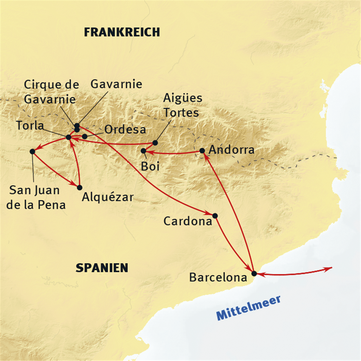 Über einige Pyrenäenpässe gelangen wir heute zunächst in das Val d’Aran, einer spanischen Enklave auf der französischen Nordseite der Pyrenäen. Unserere Mittagspausen machen wir in Vielha, der Hauptstadt des Aran Tals, und gelangen dann zurück auf die katalanische Südseite der Pyrenäen. Vom Übergang, dem “Port de la Bonaigua”, aus sehen wir die mächtigen Gletscher des Aneto, des höchsten Berges der Pyrenäen (3404 m), und erreichen am Nachmittag unser heutiges Ziel La Seu d'Urgell. Wir übernachten in einem ehemaligen Dominiker Kloster, dem heutigen Parador. Nach dem Check-in Spaziergang durch den mittelalterlichen Ortskern und Besuch der im romanischen Stil erbauten Kathedrale (Fahrtzeit: 5 Std. , 261km)
