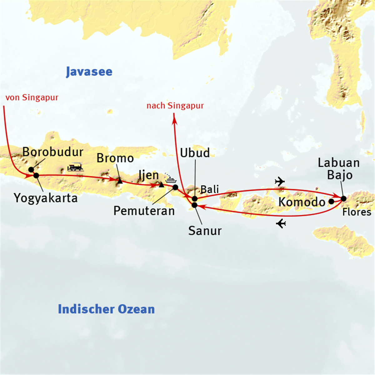 Wir begeben uns auf eine malerische Zugfahrt (ca. 3,5h) in Richtung Osten durch Java und genießen die Landschaft. Nach unserer Ankunft in Mojokerto beginnen wir mit einer Erkundungstour mit dem Tikus-Tempel, einer alten königlichen Badestätte, die tief in der Geschichte des Majapahit-Königreichs im 12. Jahrhundert verwurzelt ist. Anschließend besuchen wir weitere Monumente aus dem Majapahit-Königreich. Wir setzen unsere Reise über Land zum Mount Bromo fort, wo wir die Nacht verbringen.