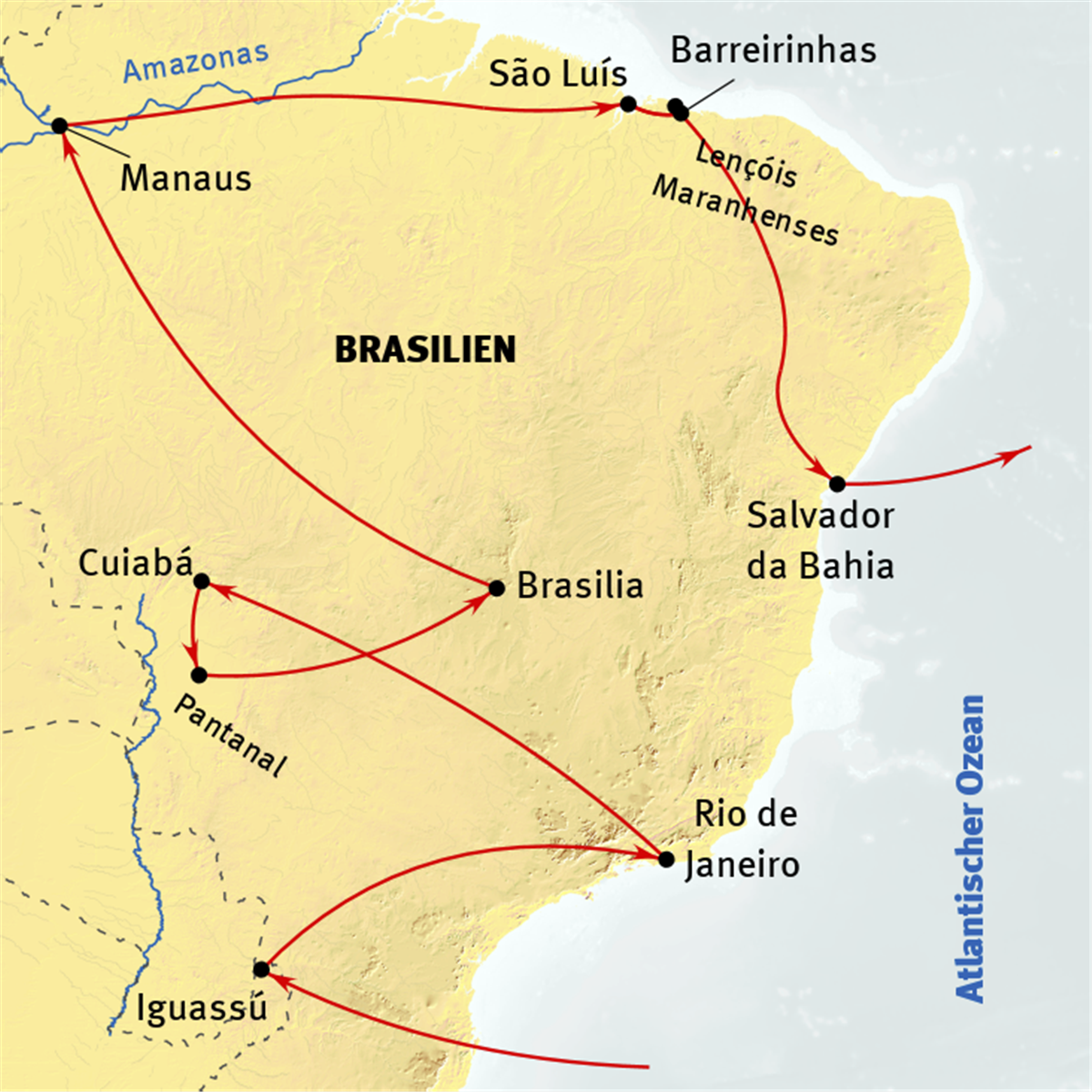 Nach einer Sonnenaufgangstour stromabwärts bis zum "Meeting of the Waters", wo sich das gelbe Wasser des Amazonas mit dem schwarzen Wasser des Rio Negro vereint. Mittags Ankunft in Manaus. Nachmittags Flug über Brasilia nach São Luís an der Atlantikküste im Norden des Landes gelegen.