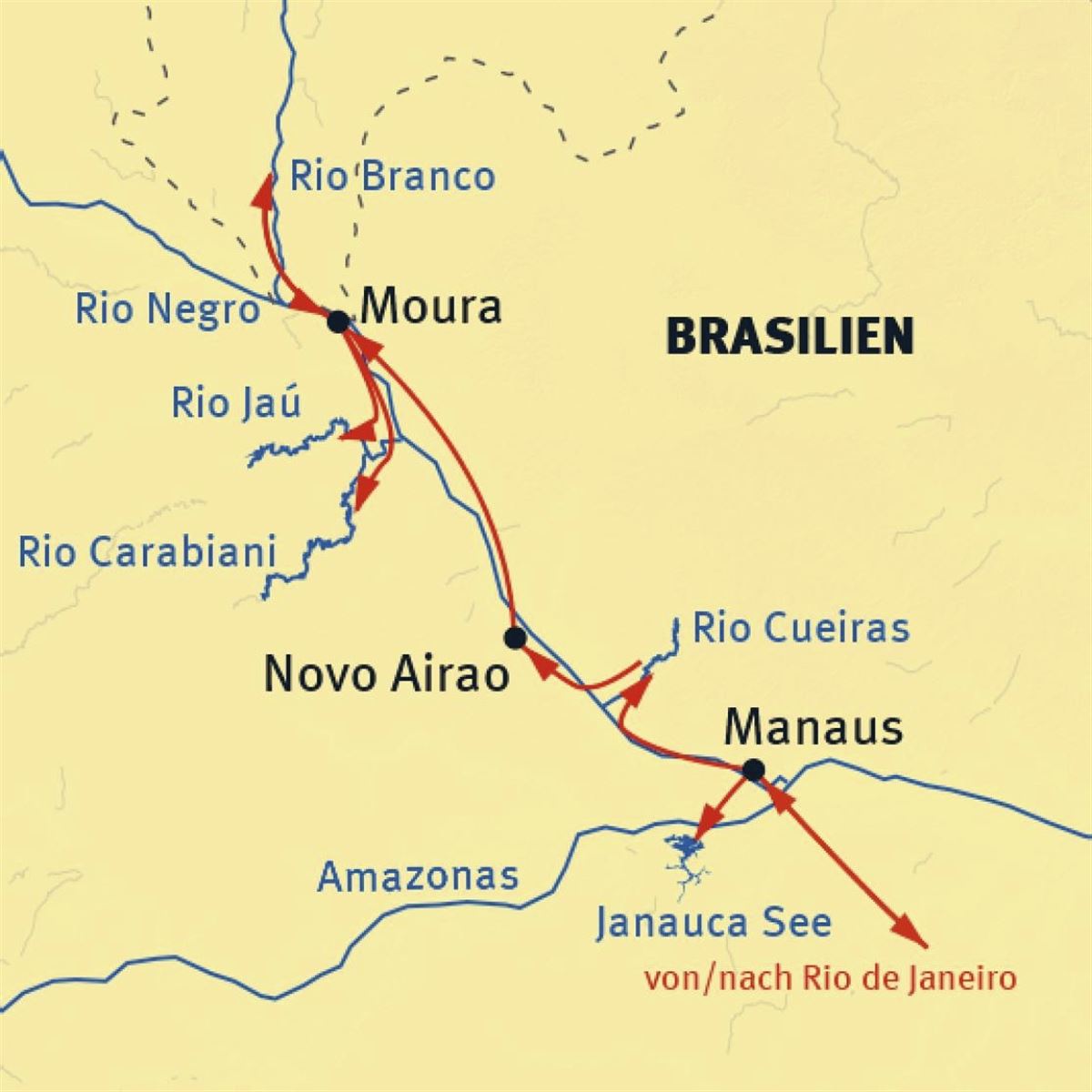 Am frühen Morgen Flug nach Manaus im Amazonas, unser Ausgangsort für die Bootstour. Transfer zum Hafen und Einschiffung auf unserem Expeditionsboot. Nach Bezug der Kabinen legen wir ab und fahren bis zum Janauary-See. Wir kommen in das "gelb-braune" Wasser des Rio Amazonas. Fahrten mit Kanus, um die "Victoria Regina", die riesigen Seerosen aufzusuchen. Mit dem großen Boot weiter zum Janauca-See, ein typisches Fischgebiet: viele Piranhas, daneben aber auch zahlreiche Affen und Vögel. Ein Nachtausflug mit den Beibooten.