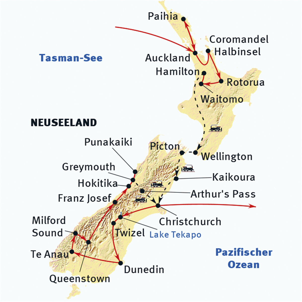 Neuseeland begeistert mit spektakulärer Natur, Maori-Kultur und modernen Städten – erlebt auf dieser besonderen Reise per Bus und legendären Panoramazügen. Höhepunkte sind Fahrten mit der DRIVING CREEK Eisenbahn, dem NORTHERN EXPLORER, dem COASTAL PACIFIC EXPRESS, der TAIERI GORGE RAILWAY und dem weltberühmten TRANZALPINE EXPRESS. Alle Strecken führen durch abgelegene Landschaften, die nur auf Schmalspur erreichbar sind, viele mit offenen Aussichtswagen.