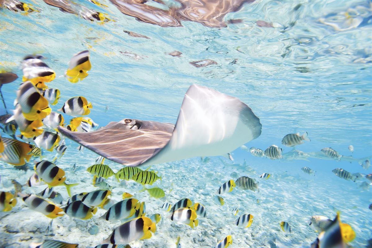 Moorea ist außerdem ein Paradies für Taucher und Schnorchler, denn das umgebende Korallenriff beherbergt eine reiche Unterwasserwelt mit Rochen, Haien und bunten Fischen.