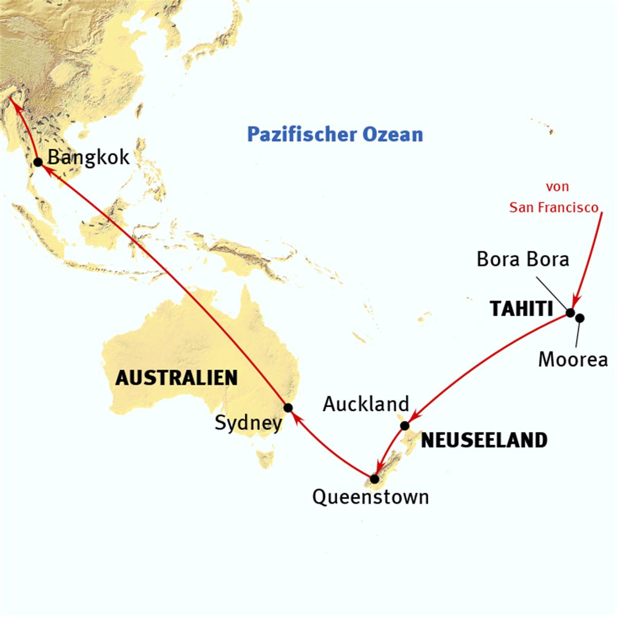 San FranciscoInsel TahitiPapeeteInsel Bora BoraInsel MooreaAucklandQueenstownSydneyBangkokTwizelTe AnauManly