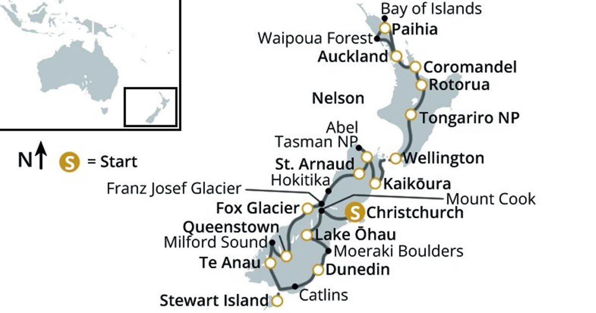ChristchurchDunedinAucklandCoromandelRotoruaTaupoQueenstownWellingtonPictonPunakaikiHokitikaMatakohePaihiaBlenheimSt. ArnaudNelsonHaastArrowtownTe AnauStewart IslandBluffOtago HalbinselMoerakiTwizel