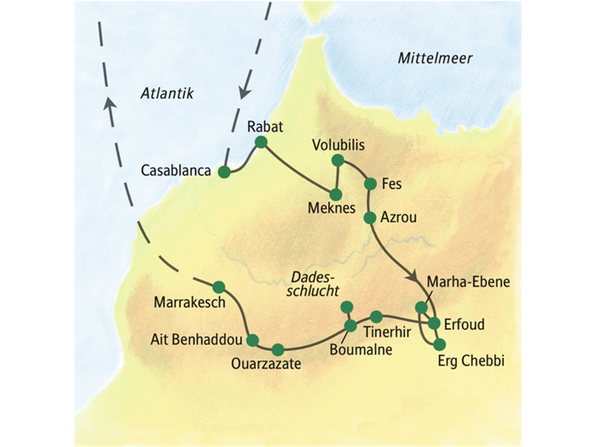 Nach dem Frühstück begrüßt Sie Ihr Studiosus-Reiseleiter und zeigt Ihnen die Schokoladenseiten Casablancas wie die elegante Küstenstraße Corniche und die Moschee Hassans II., deren gewaltige Dimensionen sowohl von außen wie auch im Inneren beeindrucken. Auf der Autobahn geht es zügig in die Hauptstadt Rabat. 100 km. Beim Mausoleum Mohammeds V. und Hassans II., der letzten gestrengen Herrscher des Landes, verrät Ihr Reiseleiter, welche Rolle der König heute spielt. Wenn die Sonne tiefer sinkt, lassen wir uns durch die blau-weißen Gassen der Kasbah des Oudaias (UNESCO-Welterbe) treiben. Von den Mauern der Festung schweift der Blick schließlich weit übers Meer. Wie Marokko schmeckt, kosten wir beim ersten gemeinsamen Abendessen.