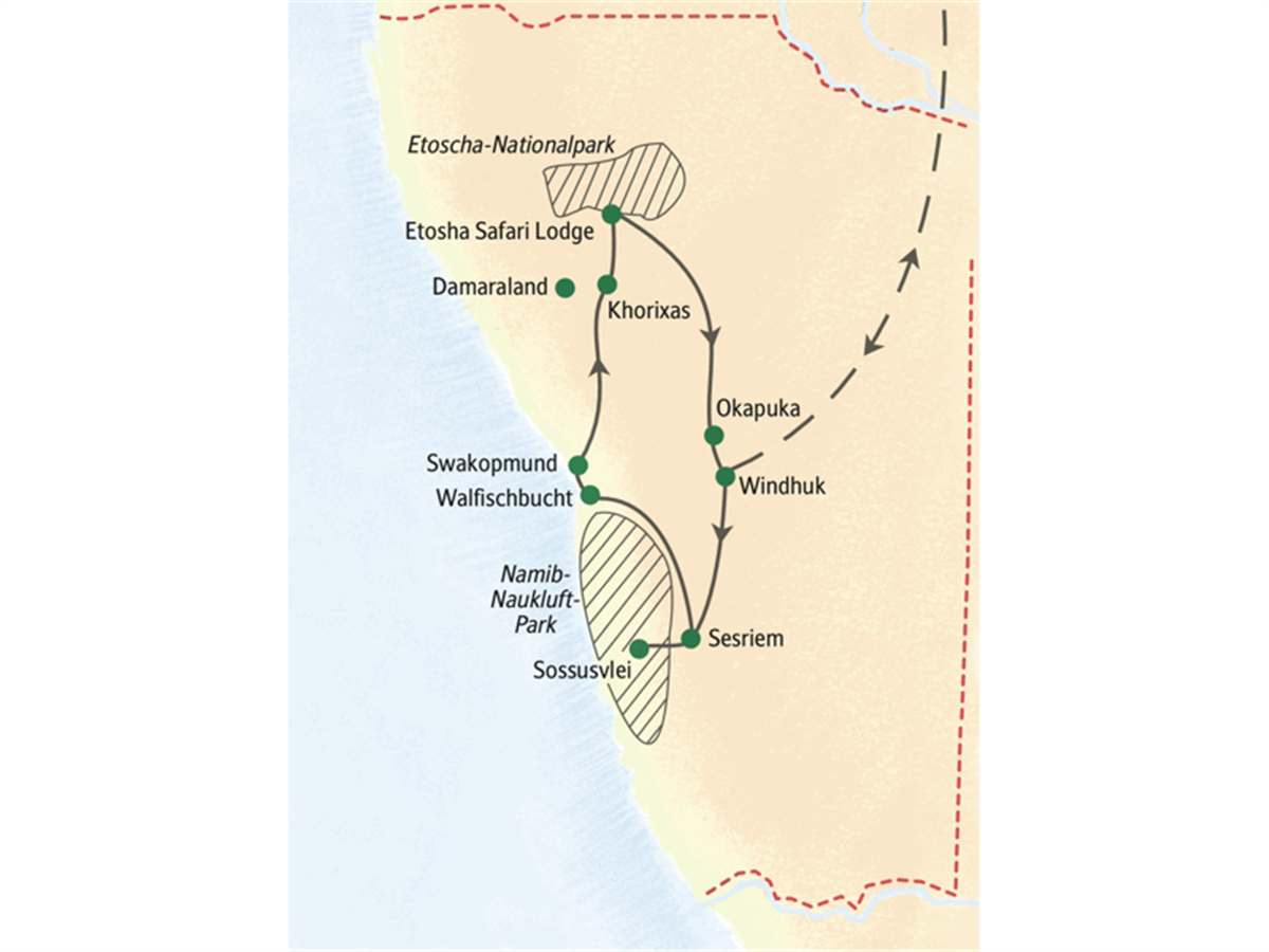 Das Tierparadies Etoscha, das Atlantikseebad Swakopmund und natürlich die Namib, die älteste Wüste der Welt mit ihren grandiosen Sandbergen – alle Höhepunkte Namibias sind auf dieser geruhsamen Studiosus-Reise versammelt. Manches kleine Extra haben wir eingeplant: So mischen wir uns bei Bier und Steaks im Pub unter die Namibier oder zelebrieren Austern und Sekt in der Walfischbucht. Ein überschaubarer Radius, immer wieder eingestreute Ruhetage und Mehrfachübernachtungen in komfortablen, naturnahen Lodges sorgen dafür, dass Ihre Erholung nie zu kurz kommt.
