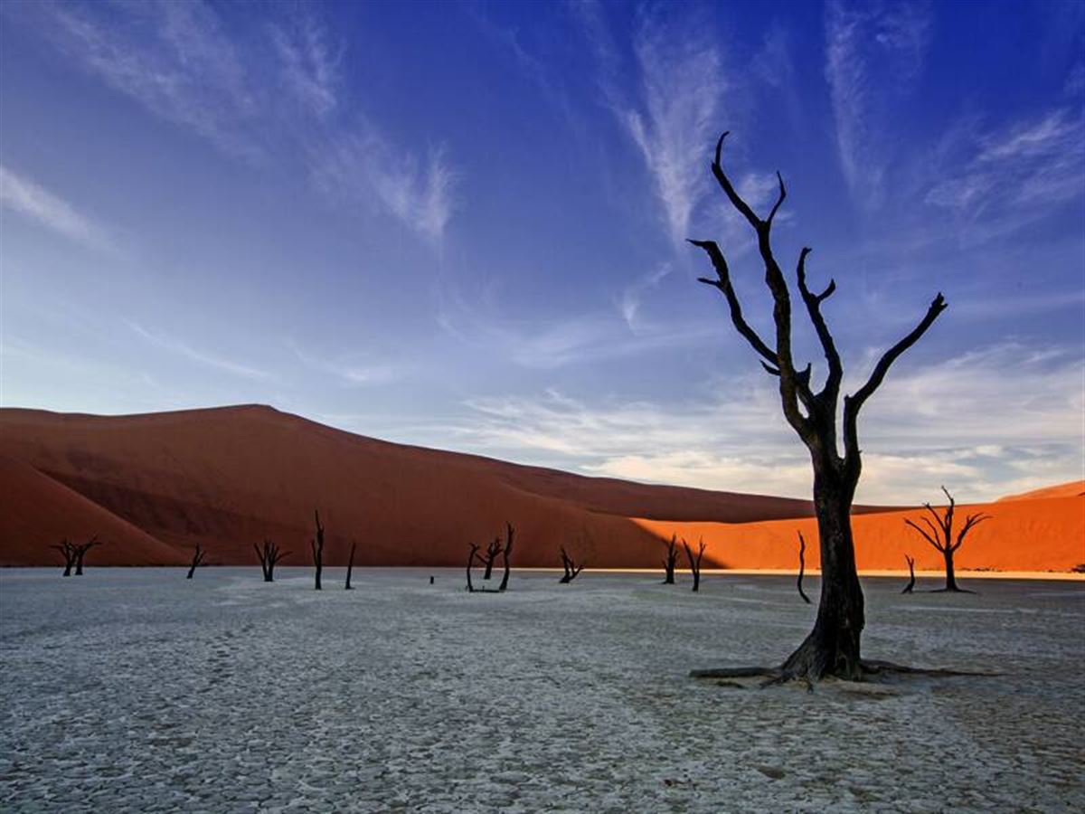 Kurz vor Sonnenaufgang brechen wir per Bus in die Namib auf. Für die letzten 5 km durch tiefen Sand wechseln wir auf geländegängige Fahrzeuge. Bis zu 300 m ragen die Sandberge rund um die Lehmpfanne des Sossusvleis orangerot in den blitzblauen Himmel. Für mehr Weitblick können Sie einen der Sandriesen besteigen – vielleicht barfuß, um den Wüstensand zwischen den Zehen zu spüren. Oder Sie erleben das Spiel der Farben gemütlich von unten. 130 km. Nachmittags können Sie am Pool entspannen.