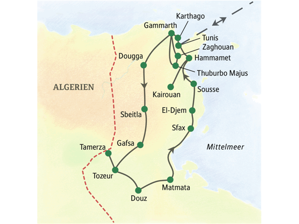 Tunesien bietet reiche Vielfalt! Wir schwelgen in der Farbenpracht von Sidi Bou Said und in den Düften und Köstlichkeiten in den Souks. Im antiken Karthago begegnet uns die uralte Kultur der Phönizier und im Bardo-Museum von Tunis die weltweit bedeutendste Sammlung römischer Mosaiken. Den Pulsschlag des Lebens im heutigen Tunesien können wir bei der Begegnung mit Studenten des Goethe-Instituts fühlen. Eine Reise, farbig wie ein Kaleidoskop - von der Mittelmeerküste bis in paradiesische Wüstenoasen.