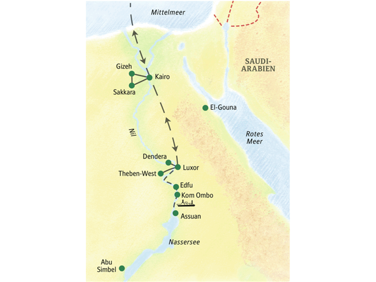 Bahnanreise 1. Klasse zum Flughafen und Flug mit Lufthansa nach Kairo, alternativ Flug mit Austrian oder mit Egypt Air. Wann immer Sie in Ägypten landen, für den Transfer zum Hotel ist gesorgt. Zwei Übernachtungen in einem Hotel direkt am Nil.