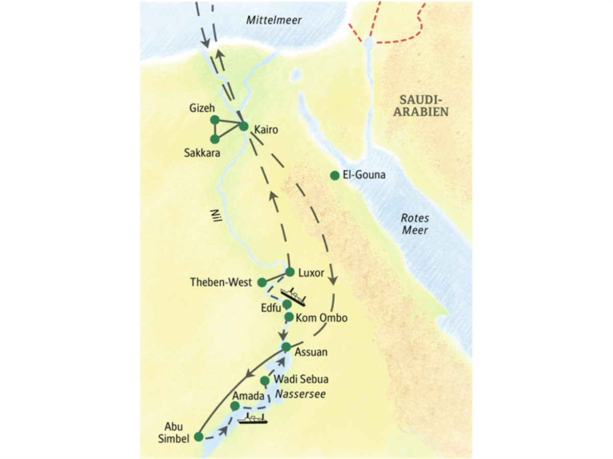 Mit den ersten Sonnenstrahlen lichtet unser Schiff den Anker und gleitet an den Tempeln von Abu Simbel vorbei, wenn das Fotolicht am besten ist. Dann treiben wir auf dem Nassersee verborgenen Schätzen entgegen: dem Tempel von Amada mit fein gemeißelten Reliefs und dem Ed-Derr-Tempel - außen unscheinbar, innen ein Farbentraum. Hier lüftet Ihr Reiseleiter ein Geheimnis und lädt zur Suche nach den Königskartuschen, den Reliefdarstellungen der Herrschernamen, ein.