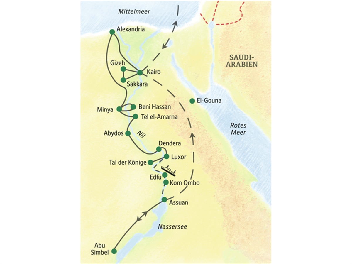 Die großen Wunder Ägyptens von Alexandria bis Abu Simbel bei unserer ausführlichsten Reise: In Alexandria betreten Sie die Bibliothek, vor den Pyramiden von Gizeh stehen Sie und schauen zum riesigen Sphinx empor. Nur bei dieser Reise bringen wir Sie auch nach Mittelägypten zur Echnaton-Stadt Tel el-Amarna und nach Abydos. Fühlen Sie die Ewigkeit in den Tempeln von Karnak und Luxor! Ihre Reiseleiterin führt Sie zu mystischen Tierkulten und verschafft Zugang zur Götterwelt des alten Ägyptens. Dazu eine Runde auf einer Feluke - einem traditionellen Segelboot -, ein Gang durchs Tal der Könige und einen ganzen Tag in Abu Simbel. Fügen Sie Augenblicke voller Rätsel und Erhabenheit zu Ihrem persönlichen Ägyptenbild! Es ist ein Souvenir fürs Leben.