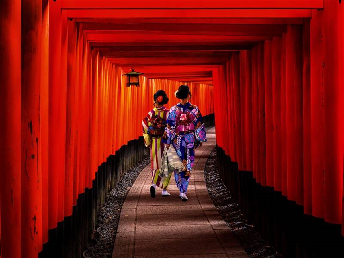 Im Sanjusangendo-Tempel staunen wir vor 1001 goldenen Figuren darüber, wie hier der Gott des Mitgefühls geadelt wird. Dann folgen wir den Klängen der japanischen Bambusflöte in den weitläufigen Garten des Tempels Daigo (UNESCO-Welterbe) und tauchen in die Schönheit der Jahreszeiten ein. Der Nachmittag ist frei - bleiben Sie doch in der Gegend und kosten Sie im nahen Fushimi lokales Streetfood wie Tintenfischbällchen. Oder lockt Sie der Besucherstrom aus aller Welt durch die auf Instagram berühmt gewordenen zinnoberroten Tore die Hügel hinauf, die den Fushimi-Inari-Schrein umgeben? Zurück in die Stadt geht es mit dem Vorortzug.