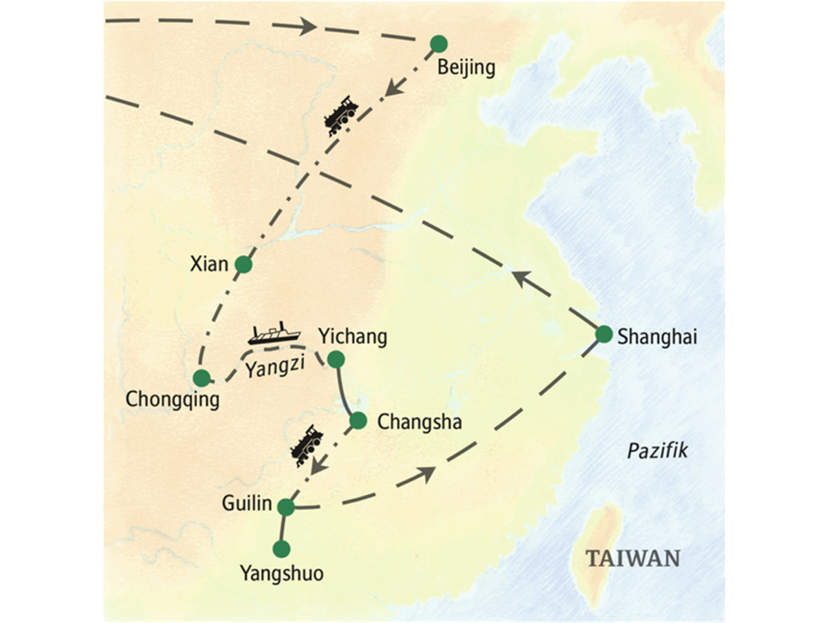 Als ob Sie ein Kaleidoskop in Händen halten, das Sie nur zweimal drehen müssen: Schon formen sich vor Ihren Augen leuchtende Bilder aus Vorgestern und Übermorgen, aus Landschaftsmalerei und Großstadtkonzert. Auf dieser Reise streifen wir die Highlights des einstigen Kaiserreichs von der Verbotenen Stadt in Beijing über die Große Mauer bis zur futuristischen Architektur von Changsha und Shanghai. Zwischendurch atmen wir das Flair der legendären Seidenstraße. Wir rauschen im Hochgeschwindigkeitszug durch die Zeit, entspannen bei einer Flusskreuzfahrt auf dem Yangzi und treiben durch die Märchenwelt am Li-Fluss. Vielleicht nehmen Sie einen bunten Fächer aus Fuli mit nach Hause, ganz sicher aber ein farbenfrohes Bild vom Reich der Mitte – geschickt in nur zwei Wochen herbeigezaubert.