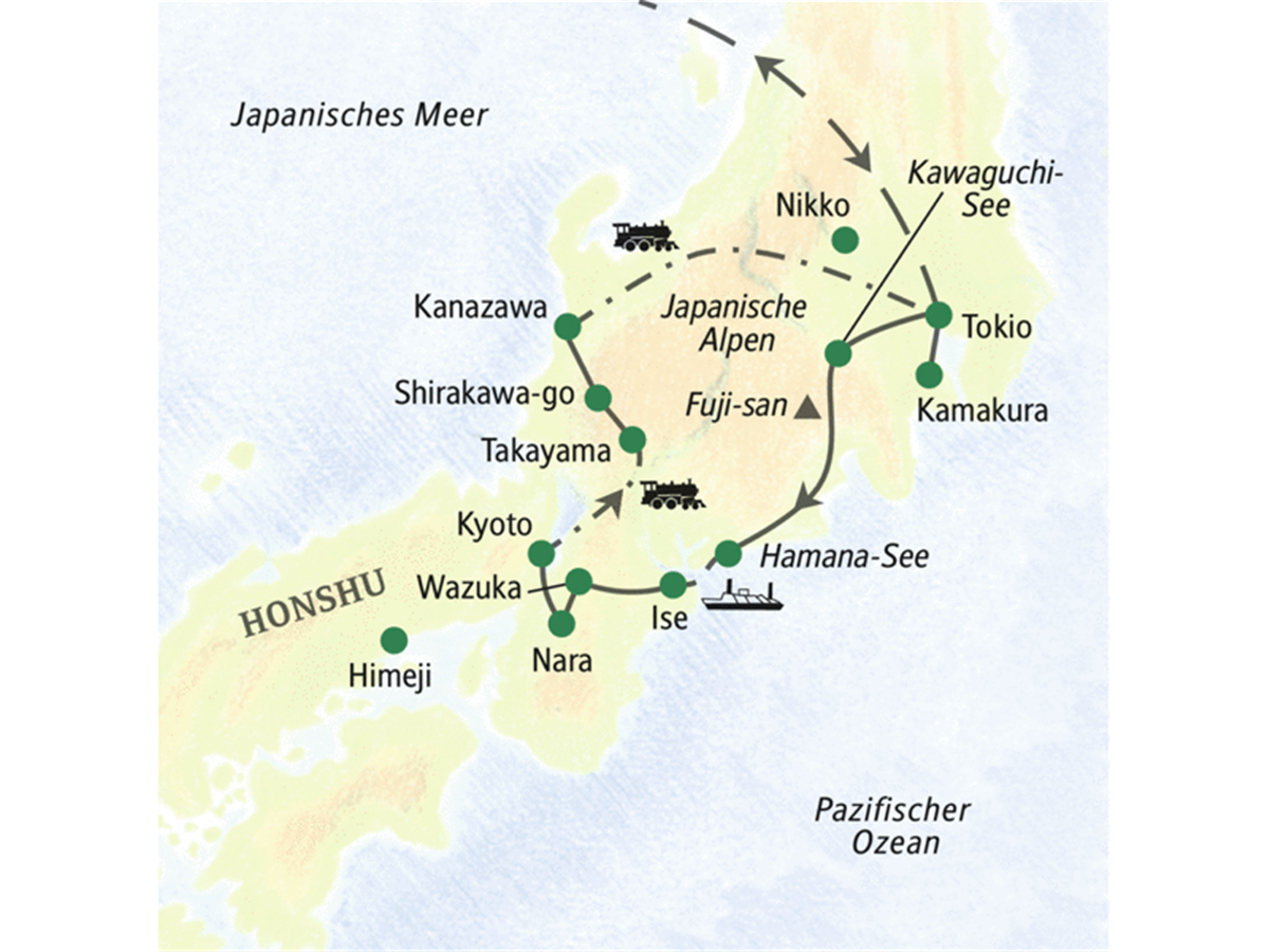 Gestärkt von einem typisch japanischen Frühstücksbuffet brechen wir auf Richtung Fuji-san (UNESCO-Welterbe). Unterwegs in der Bergwelt halten wir bei einer Bootsfahrt auf dem Kawaguchi-See Ausschau nach der beeindruckenden Schönheit: Ob sich der heilige Berg blicken lässt oder sein Gesicht scheu in Nebel hüllt? In einer traditionsreichen Sakebrauerei lüftet anschließend der Braumeister für uns sein Erfolgsrezept: sanftes Quellwasser aus den Tiefen des heiligen Berges, bester Reis und von Generation zu Generation weitergegebene Handwerkskunst. Im Gespräch bei einem Glas Sake berichtet er von der auch hier schwierigen Nachwuchssuche. Stimmungsvoll geht es weiter zum Hamana-See: Unseren Weg begleiten die Klänge des Koto, der japanischen Zither. 320 km.