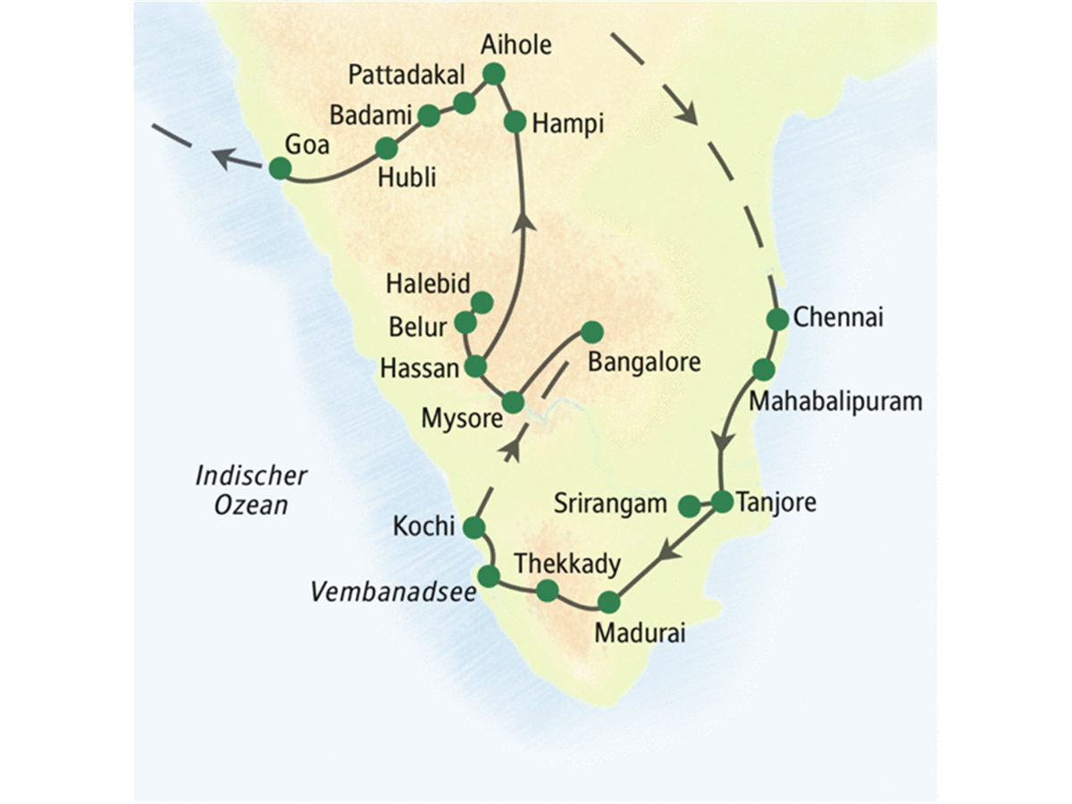 Über Highways und Landstraßen geht es durch das Herz Karnatakas. Viel hat sich nicht verändert, seit hier große Dynastien geherrscht haben. Doch so anmutig die Dörfer wirken, das Leben auf dem Land ist hart: Abhängigkeit vom Monsun, das Kastenwesen und ärztliche Unterversorgung machen den Menschen zu schaffen. Wir erreichen die Tempelstätte von Aihole. Einige Tempel haben die Zeit überdauert, wenn auch manche inzwischen eine neue Verwendung gefunden haben. In den Sakralbauten von Pattadakal (UNESCO-Welterbe) wurden einst Herrscher gekrönt. Für die Höhlen von Badami müssen wir heute mangels Alternative ausnahmsweise mit einem einfacheren Hotel vorliebnehmen. 170 km.