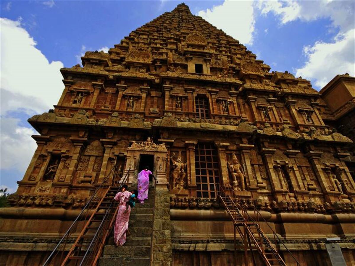 Palmen, Zuckerrohr und kleine Dörfer säumen unsere Fahrt in die Kaveri-Ebene nach Tanjore. Indische Musik gewünscht? Ihre Reiseleiterin hat ein breites Spektrum im Angebot – von traditionell bis modern, von Ravi Shankar bis zur Filmmusik für "Slumdog Millionär". In der Ville Blanche von Pondicherry erinnern aber auch die roten Mützen der Polizisten an die französische Kolonialgeschichte in Indien. Dann erkunden wir ein weiteres Juwel unter den Bauwerken der Chola-Könige: den Airavateshvara-Tempel in Darasuram (UNESCO-Welterbe). 270 km. Zwei Übernachtungen in Tanjore.