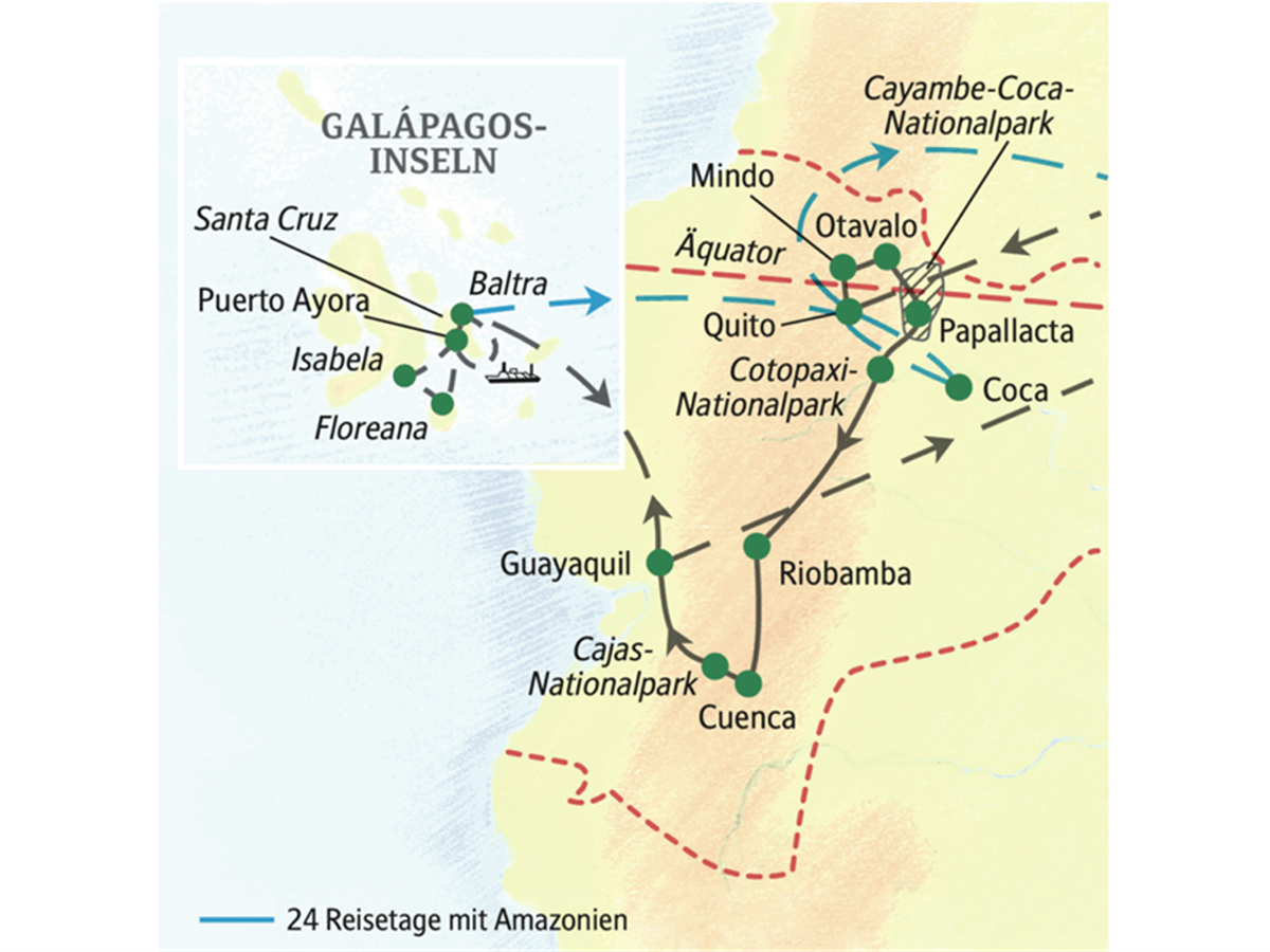Unser Ausflugsboot nimmt heute Kurs auf die Plazas-Inseln. Schnorchelnd tauchen wir an der Punta Carrión in die farbenfrohe Fischwelt ein, bevor uns auf der kleinen Lavainsel Plaza Sur Seelöwen in Empfang nehmen. Auf dem Inselpfad zwischen Riesenopuntien umflattern uns auf unserer Wanderung (1,5 Std., leicht, ↑↓ 0 m) Kaktusfinken und Gabelschwanzmöwen, Landleguane huschen vorbei. Einzigartig ist auch die Vegetation: ein Meer von Sesuviumpflanzen, endemische Gewächse, die die Insel je nach Jahreszeit grün, gelb, rot oder violett färben. Stilecht verabschieden wir uns von Ecuador beim Dinner in einem landestypischen Restaurant, je nach Geschmack gern auch mit frischem Pescado del Día - dem Fang des Tages.