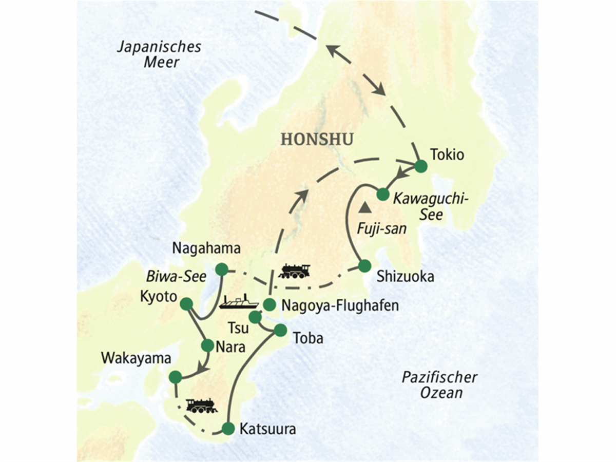 Der Showa-Kinen-Park wirft seine herbstbunte Picknickdecke für Sie aus – gut, dass Ihre Reiseleiterin leckere Bento-Boxen dabeihat. Es geht komfortabel weiter im Reisebus, heute mit Kurs auf den heiligen Berg Fuji. 600 km/h schafft allerdings nur die neue Magnetschwebebahn, die gerade in der Region gebaut wird – wir lassen uns das rasante Projekt zeigen. Entschleunigen können Sie in unserem Hotel am Fuße des heiligen Berges: Ihre Reiseleiterin weist Sie in den Badeknigge ein, bevor Sie in den Thermalbereich, Onsen genannt, eintauchen können. 120 km.
