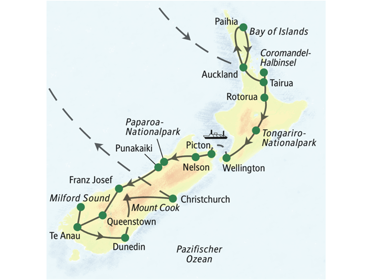 Ein tektonischer Hexenkessel: Es zischt, blubbert und brodelt, und die Erde haucht uns beim Spaziergang im Waimangu-Tal ihren Schwefelatem ins Gesicht. Welche Rolle Geothermie im Energiemix des Landes spielt, erfahren wir auf dem Weg zum Lake Taupo. Kaum zu glauben: Das friedliche Paradies für Ausflügler und Angler ist Resultat eines erdgeschichtlichen Super-GAUs. Dann grüßen aus der Ferne schon die Vulkane des Tongariro-Nationalparks (UNESCO-Welterbe). 210 km. Den bildschönen Kegel des unruhigen Mt. Ngauruho – Schicksalsberg im Film "Der Herr der Ringe" – sehen wir aus dem Busfenster. Abends im Hotel lädt Ihre Reiseleiterin zum Kinoerlebnis ein: Taschentücher nicht vergessen, die Geschichte des Maorimädchens Paikea rührt auch Männerherzen!