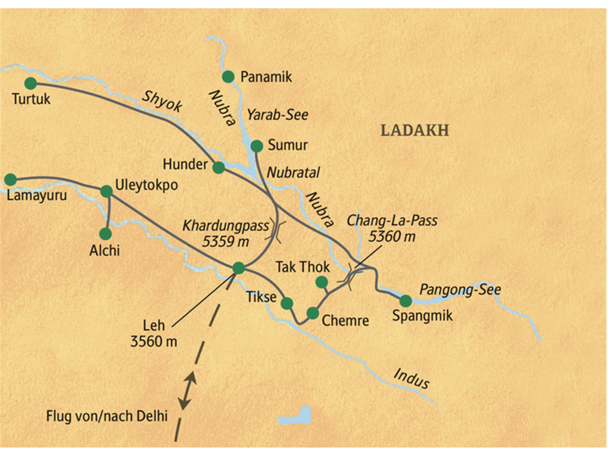 Das Flugzeug bringt uns in etwa eineinhalb Stunden nach Norden. Bei gutem Wetter schweift der Blick von oben weit über die großartige Bergwelt von Ladakh. Nach der Landung in Leh geht es weiter nach Uleytokpo. 70 km. Unser Hotel empfängt uns in wunderbarer Lage – direkt am Ufer des Indus. Akklimatisieren Sie sich in aller Ruhe – wir sind auf rund 3000 m Höhe. Drei Übernachtungen in Uleytokpo.
