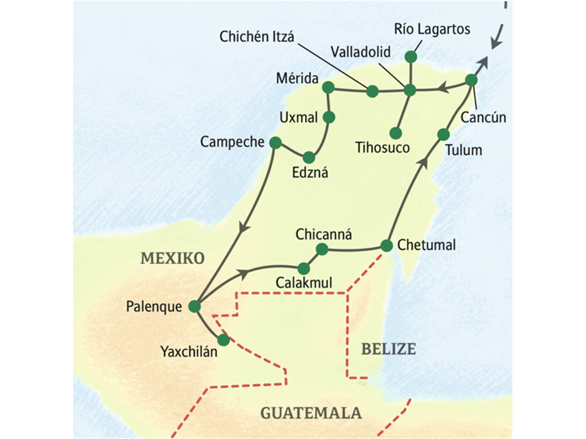 Am frühen Morgen Fahrt nach Frontera Corozal, am Grenzfluss zu Guatemala. Unser Boot gleitet - vorbei an Krokodilen - auf dem Río Usumacinta flussabwärts: undurchdringliches Dschungelgrün, der monotone Gesang der Zikaden. Allein der Weg wäre ein Ziel! Dann die Ruinen von Yaxchilán mitten im Regenwald: bemooste Stelen, Hieroglyphenbänder und Pyramiden unter dem Blätterdach, durch das sich mühsam die Sonnenstrahlen kämpfen. Ohrenbetäubend das Geschrei der Brüllaffen in den Baumkronen. Ihr Reiseleiter erweckt eine glanzvolle Metropole, die irgendwann im Dschungel versank, wieder zum Leben. Busstrecke 330 km.