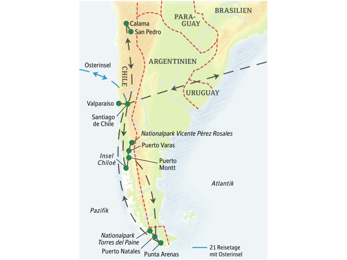 Freizeit bis zur Fahrt zum Flughafen für letzte Souvenirs und eigene Unternehmungen. Vielleicht schauen Sie noch im Museum der schönen Künste im Zentrum der Stadt vorbei? Es hält für Fans moderner Kunst manche Überraschung bereit. Die chilenische Malerei ist in Europa kaum bekannt, aber eine Entdeckung wert. Bei Langstreckenflug mit LATAM fliegen Sie nachmittags über Sao Paulo nach Frankfurt, alternativ am Abend nach Madrid. Air France und Iberia heben bereits am Mittag nach Paris bzw. Madrid ab. KLM bringt Sie mittags mit einem Zwischenstopp in Buenos Aires nach Amsterdam.