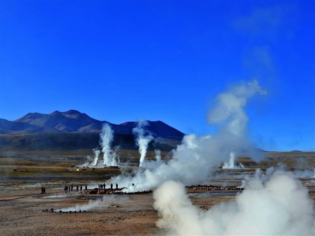 Wir wollen die Geysire von El Tatio in Aktion erleben und stehen dafür früh auf: Denn wenn die Morgensonne die nächtlichen Eishauben der heißen Quellen in 4300 m Höhe zum Schmelzen bringt, steigt der Wasserdampf bis zu 20 m in den Himmel. Die Sonnenstrahlen lassen die Dampfsäulen funkeln und leuchten wie ein bunt schillerndes Feenfeuerwerk. Wir geben uns ganz der mystischen Pracht dieser Naturerscheinung hin. Mittags geht es zurück nach San Pedro, wo wir selbst das Wasser spritzen lassen - im Pool. 160 km. Die Atacamawüste ist berühmt für ihre klaren Nächte. Abends lohnt sich ein Blick in den Himmel: Das Kreuz des Südens funkelt über uns.