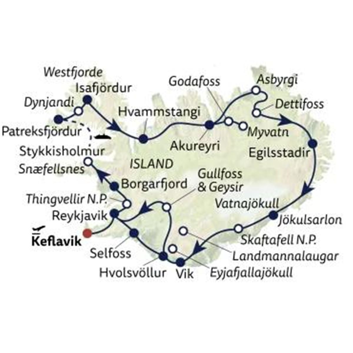 Shuttle-Transfer zum Flughafen Keflavik und individuelle Rückreise oder Verlängerung Ihres Aufenthaltes in Reykjavik.