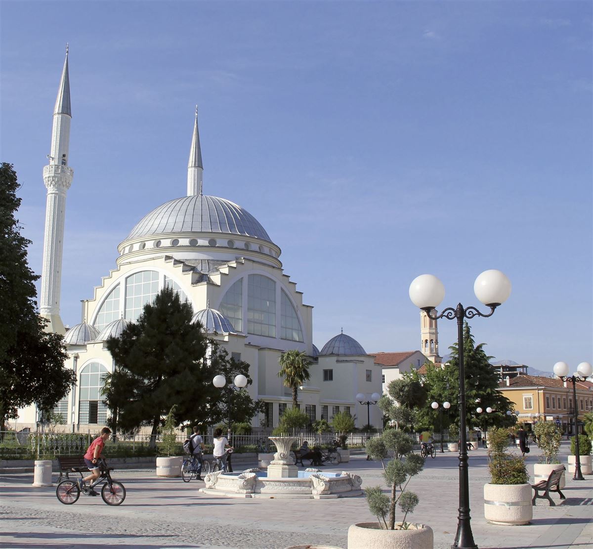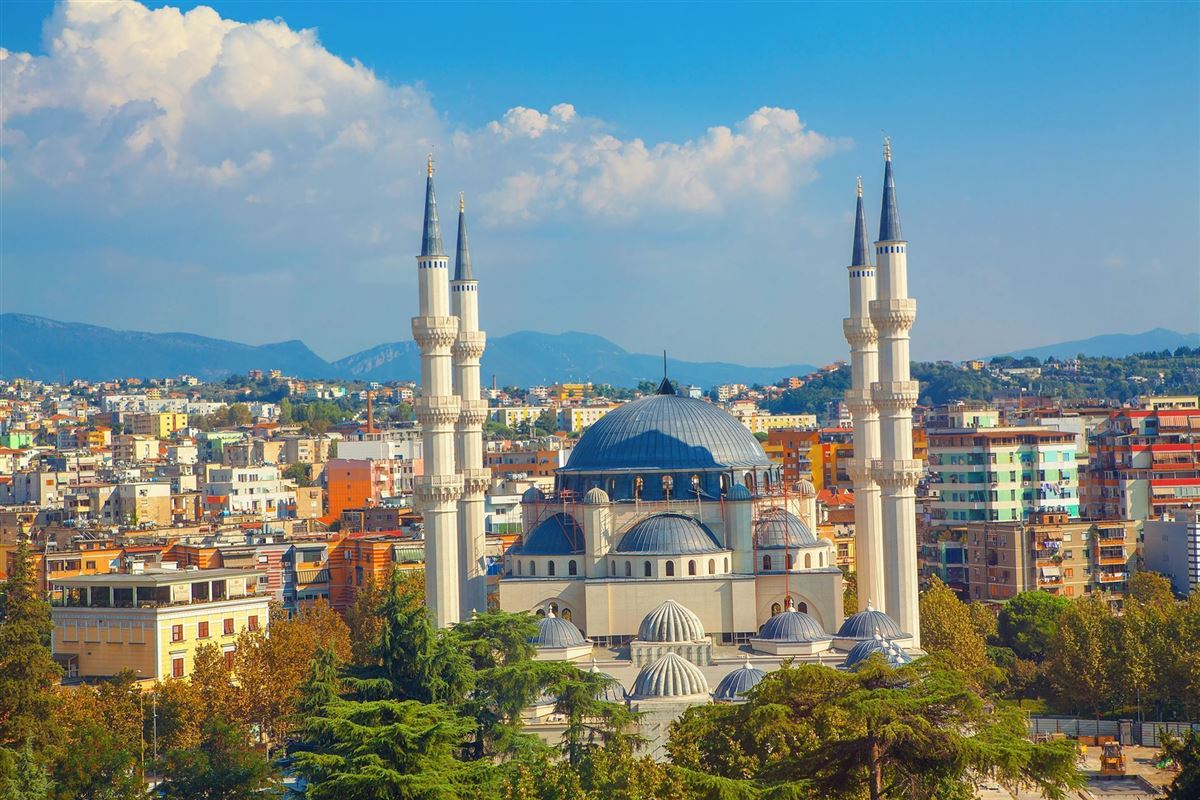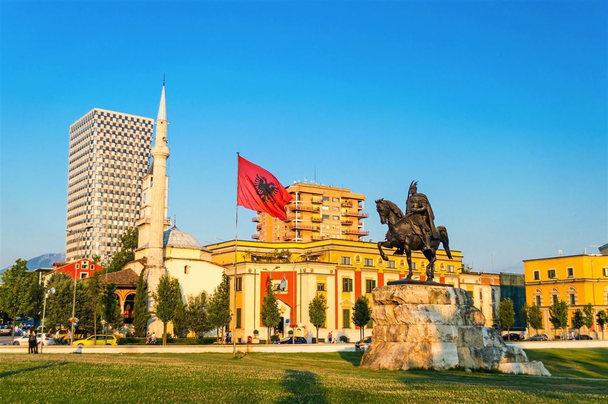 Linienflug nach Tirana. Empfang durch die Reiseleitung und Transfer zum Hotel. Anschl. Stadtbesichtigung von Tirana: Im Stadtzentrum der Skanderbeg-Platz, die Ethem-Bej-Moschee, der Uhrturm, das Rathaus, der "Boulevard der nationalen Märtyrer". Besuch im Bunkart 2, ein zum Museum umgebauter ehemaliger Atombunker. Schließlich das ehemals "kommunistische" Viertel, heute in neuem Glanz erstrahlend.