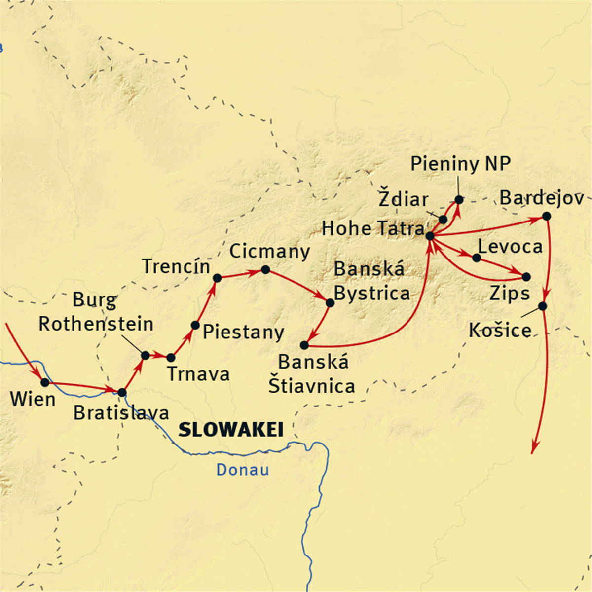 Die Slowakei hat sich seit ihrer Unabhängigkeit 1993 zu einem der gefragtesten Ziele in Sachen Winter- und Wellness-Urlaub in Zentraleuropa entwickelt. Auch der Aktivurlaub mit Wandern, Rafting, Bergsteigen, Höllenklettern, Gleitschirmfliegen oder Radtouren wird für die Slowakei ein immer bedeutenderer Tourismuszweig. Die unübertroffene Hauptattraktion des Landes ist und bleibt allerdings die Hauptstadt Bratislava. Sie ist nicht nur ein beliebter Anfahrtspunkt bei Donaukreuzfahrten, sondern wird auch für Städtereisende immer interessanter. Zu ihren bekanntesten Attraktionen gehören das alte Rathaus, das Palais Grassalkovich, die Burg Devin, das Primatialpalais, das Nationaltheater und natürlich das Wahrzeichen der Stadt – die Burg von Bratislava. Doch nicht nur die eigentlichen Sehenswürdigkeiten der Stadt laden zum erkunden und bestaunen ein, sondern auch die imposanten Barockfassaden und die ausgefallenen Szenelokale.