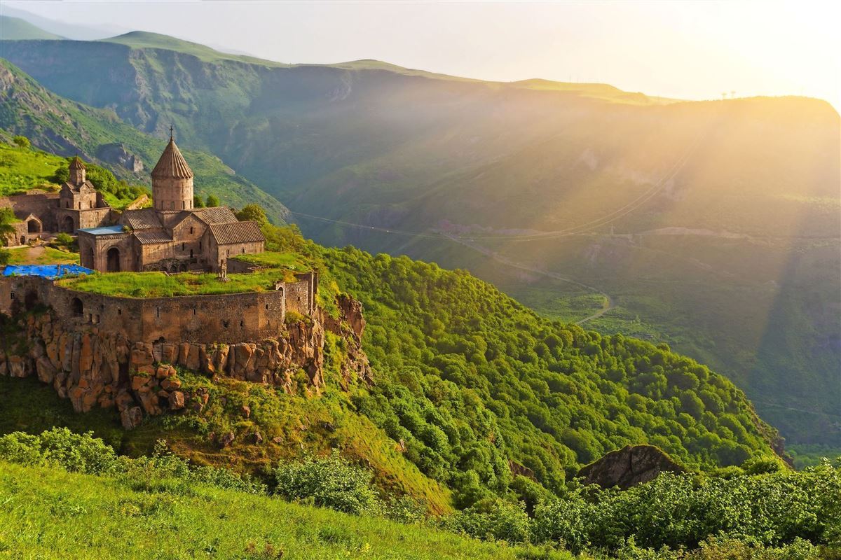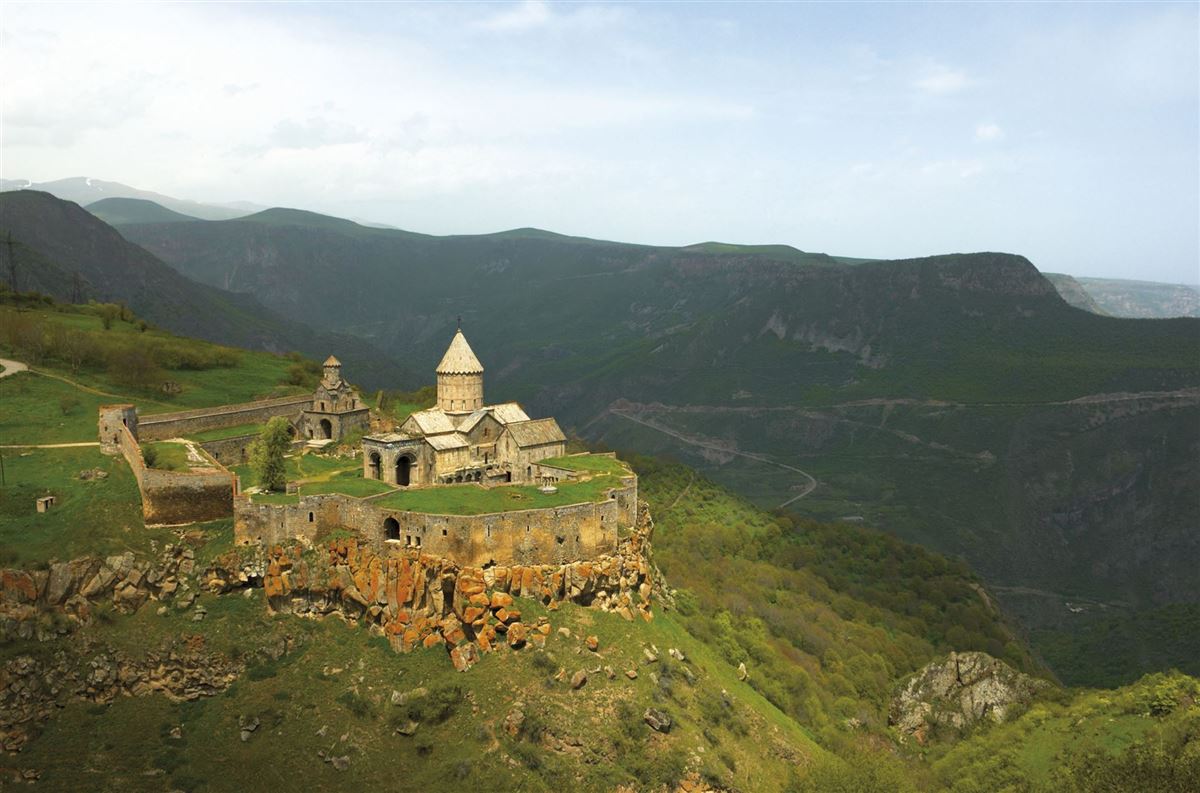 Morgens spektakuläre Fahrt mit einer der längsten Pendelseilbahnen der Welt (5.750m Länge) über die steile Worotanschlucht zur riesigen Klosteranlage Tatev. Besichtigung der weitläufigen Klosteranlage, hoch über der Schlucht gelegen. Nachm. Weiterfahrt nach Chendzoresk. Wanderung über eine Hängebrücke zum Höhlendorf und Besichtigung der Höhlen, in denen in der Blütezeit im 17. Jh. mehr als 2.000 Einwohner lebten. Rückkehr nach Goris.