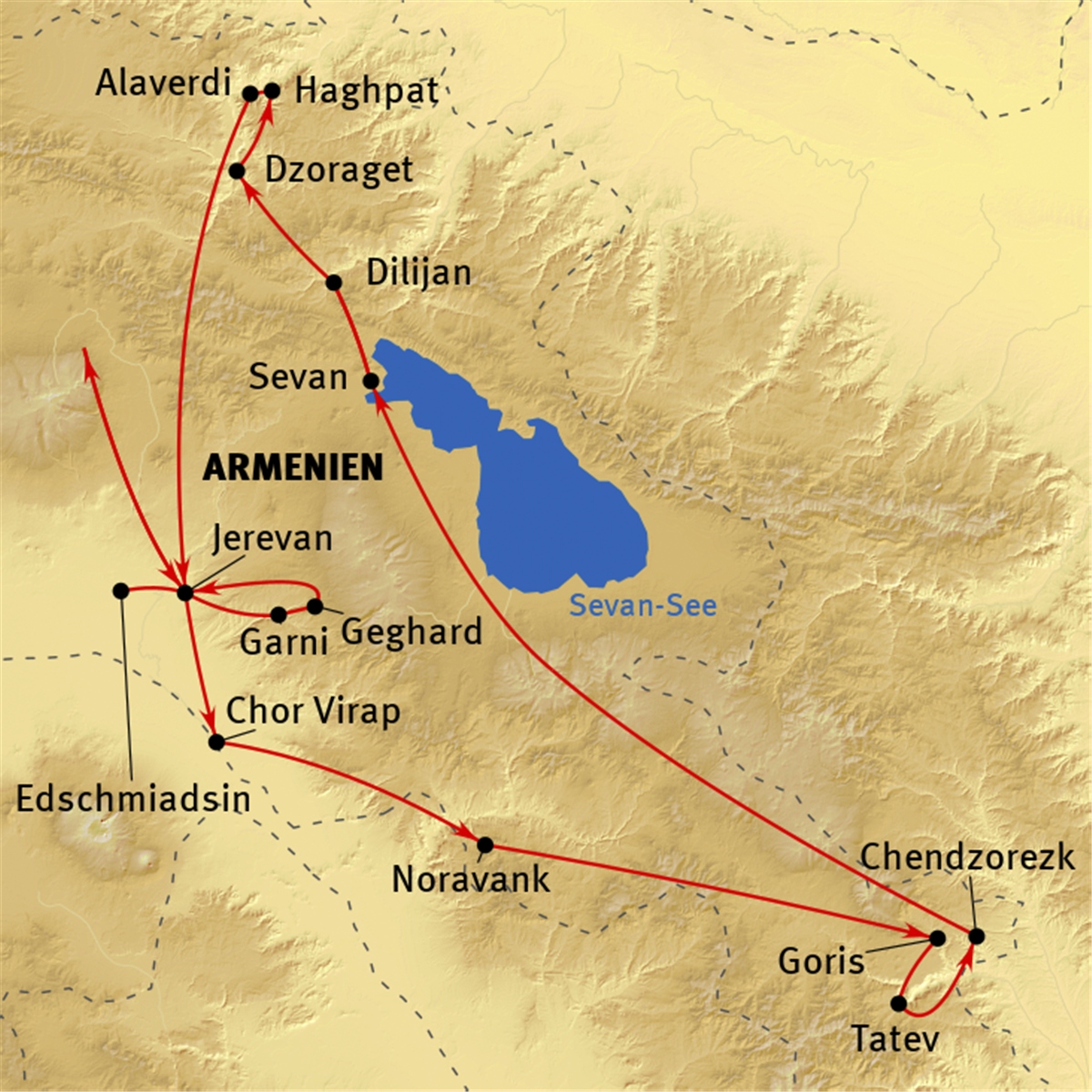Morgens etwas freie Zeit am See oder optional kleine Bootsfahrt. Anschließend Besuch des auf einer Landzunge im Sevan-See gelegenen Sevan-Klosters (9. Jh.), das lange Verbannungsort des armenischen Adels war. Heute dient die Klosterschule als Priesterseminar. Weiterfahrt durch den Sevanpass in die grüne Kurstadt Dilijan. Besuch der Scharamberyan-Straße, wo verschiedene Handwerke ihr Kunsthandwerk anbieten. Besuch der Gemäldegalerie und des Lore-Museums, wo nicht nur Gemälde, sondern auch ethnographische Werke zu sehen sind. Auf der Weiterfahrt Stopp in einem Dorf der Molokaner, einer russischstämmigen Minderheit, die zu einer kleinen Glaubensgruppe der russisch-orthodoxen Kirche gehört und seit über 200 Jahren im Kaukasus lebt und bis heute ihre eigenen Traditionen und Bräuche pflegt. Hier bekommen wir ein leichtes typisches Mittagessen. Zum Abschluss Besuch bei einem armenischen Chatschkar-Künstler, der kunstvoll behauene Gedächtnissteine meißelt. Fahrt ins Dorf Dzoraget in unser sehr schönes Hotel.