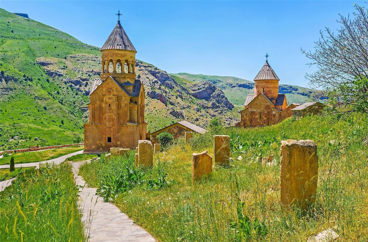 Wir verlassen Jerevan und fahren durch das Ararattal nach Chor Virap („tiefe Grube“). Das Kloster liegt unmittelbar an der türkischen Grenze. Von hier bietet sich ein herrlicher Blick auf den Ararat, den heiligen Berg der Armenier. Weiterfahrt durch das Dorf Areni und kurzer Spaziergang zum Kloster Noravank, malerisch am Ende einer Schlucht gelegen. Am Eingang zur Schlucht Besuch einer Höhle, wo Archäologen Siedlungsreste mit ca. 6000 Jahre alten Weinkrügen freigelegt haben. Nachmittags erkunden wir Zorakarer, eine der mystischsten Stätten Armeniens: Auf einer weiten, grasbewachsenen Hochebene finden wir lange Reihen von Menhiren sowie Grab- und Festungsanlagen aus dem 1. Jahrtausend v. Chr. - ob wir hier inmitten einer der ältesten prähistorischen Kultstätten des Landes stehen oder einem uralten Observatorium, darüber streiten sich die Wissenschaftler noch. Hotel in Goris.