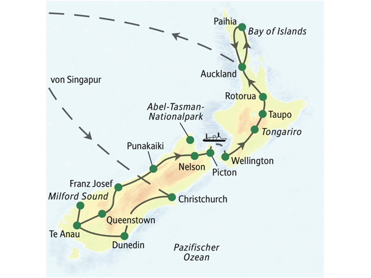 Fjorde, Gletscher und Regenwälder, Vulkane, Geysire, Weinberge und Sandstrände ... Neuseeland: zwei Inseln, ein Kontinent im Kleinformat. Kein Wunder, dass das andere Ende der Welt für viele auch das schönste ist! Wir lassen uns auf dieser vierwöchigen Rundreise anstecken vom entspannten Lifestyle der "Kiwis" und erkunden mit Muße die Wunder der Natur zwischen Milford Sound und Bay of Islands – genauso wie die spannenden Städte. Und damit Sie ganz weit weg vom Alltag auch wirklich entschleunigen können, packen wir so selten wie möglich die Koffer, entzerren die Anreise durch einen Zwischenstopp in Singapur und haben viel freie Zeit zum Genießen und Entdecken im eigenen Tempo.
