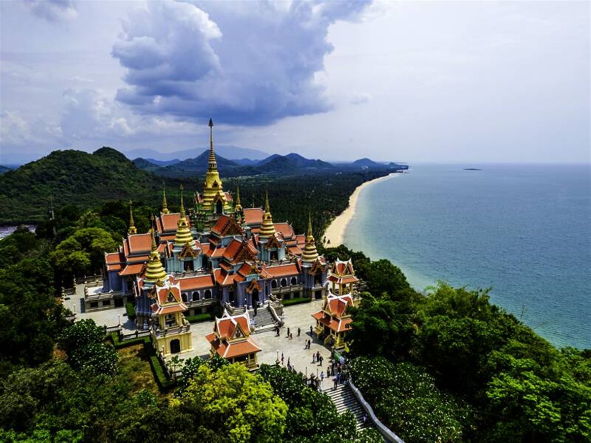 Nach dem Frühstück sammeln wir Pluspunkte fürs Karmakonto. Zuerst besorgen wir Gaben für die Mönche, die wir ihnen anschließend im Tempel Wat Huay Mongkol überreichen. Den Segen gibt es als Dankeschön mit dazu. Der Segen begleitet uns auf der Fahrt Richtung Süden. Auf dem Thong Chai Mountain thront die Tempelanlage Wat Thang Sai – ein gigantischer Ausblick über die Küste erwartet uns dort oben. Auf der Weiterfahrt nach Chumphon legen wir für einen erfrischenden Sprung ins Meer noch einen Stopp am Strand von Thuang Wua Laen ein.