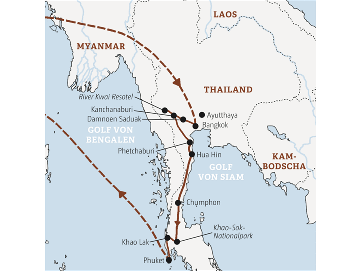 In den Khao-Luang-Höhlen bei Phetchaburi werden wir zu Höhlenforschern. Vorsichtig tasten wir uns durch die tropfnassen Felskammern, in denen Räucherstäbchen vor goldenen Buddhas glimmen. Aus dem Untergrund weiter zum Königsschloss auf thailändische Art: König Mongkuts Sommerpalast mit Hallen, Tempeln und Aussichtsturm. In der Ferne glitzert dann schon das Meer im Badeort Hua Hin. Abends nimmt Sie Ihr Scout mit auf den Nachtmarkt, wo wir uns von Garküche zu Garküche snacken.