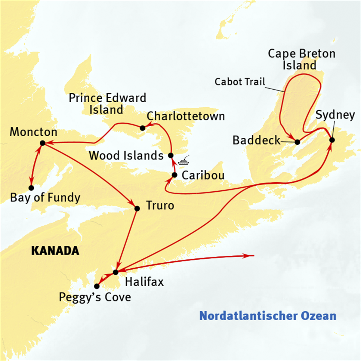 Am Morgen verlassen wir das malerische Baddeck am Bras d’Or Lake. Die Fahrt führt uns durch charmante Küstenlandschaften zur geschichtsträchtigen Stadt Pictou. Nach kurzem Stopp setzen wir unsere Route fort mit der Fährüberfahrt von Caribou nach Wood Island auf Prince Edward Island. Prince Edward Island ist Kanadas kleinste und gleichzeitig einzige Insel-Provinz und Kanadas beliebteste Insel für Naturliebhaber. Nach kurzer Fahrt erreichen wir Charlottetown. Empfehlenswert, hier den Tag in einem der gemütlichen Hafenrestaurants ausklingen zu lassen. Etwa 300 Tages-km.