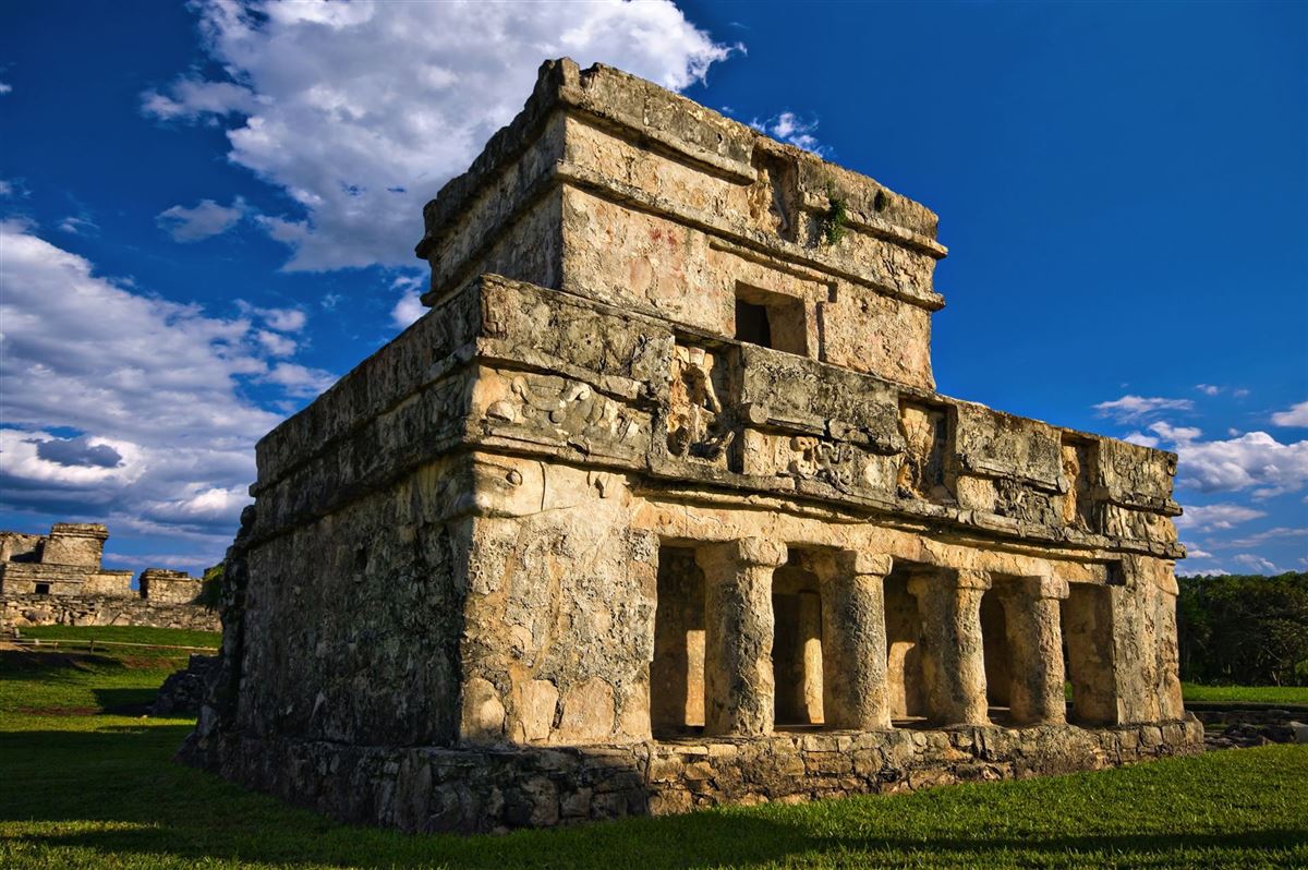 Unser Ausflug bringt uns zu der Maya-Felsenfestung von Tulum, direkt am karibischen Meer gelegen. Geblieben ist von der großen Maya-Stadt nur der Tempelbezirk mit dem Palast. Weitere Gebäude sind der Templo del Dios Descendente und der Templo de los Frescos. Tulum's Reiz liegt im Zusammenspiel der Ruinen mit dem weißen Sand und dem türkisblauen Wasser.