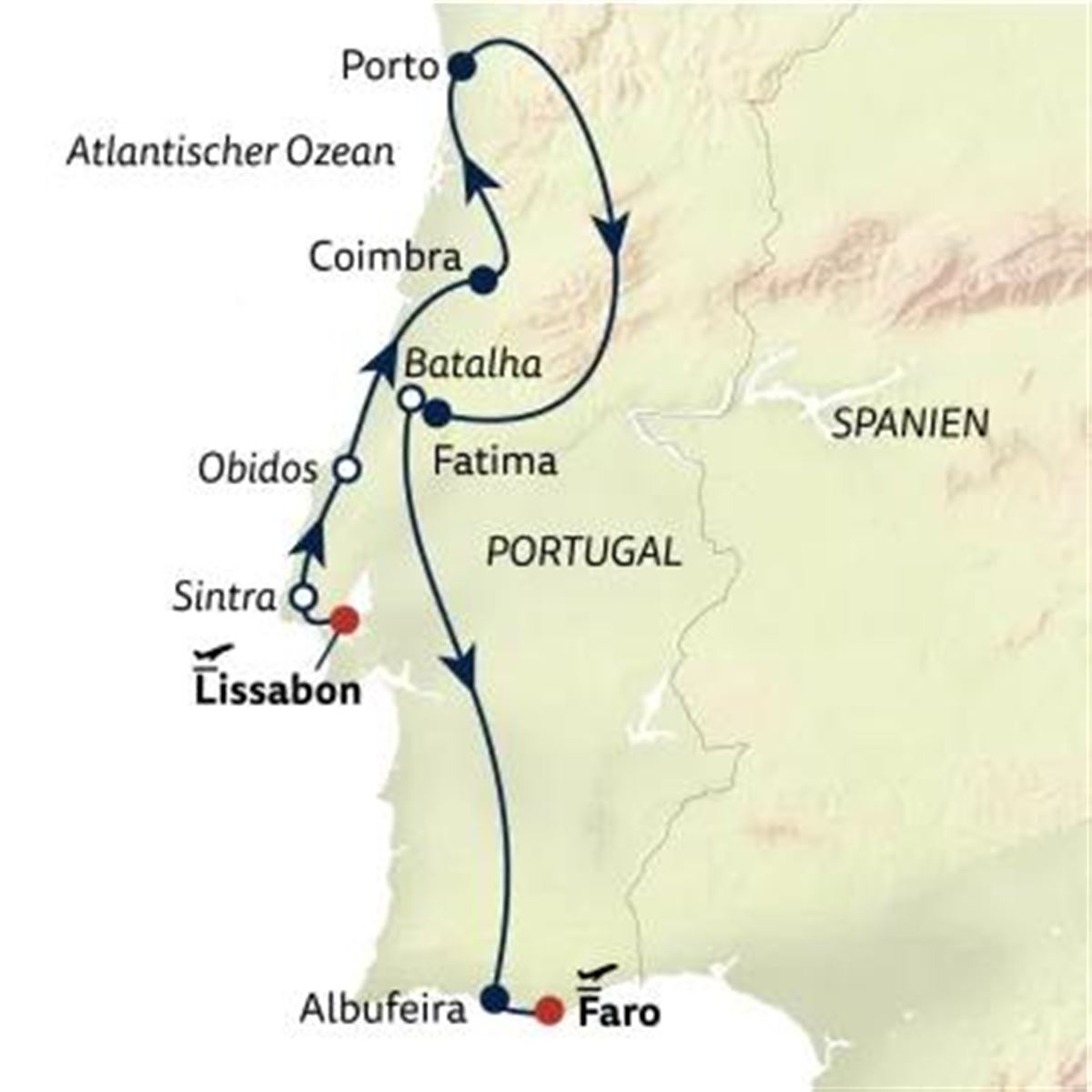 Die Reise führt Sie zunächst nach Sintra. Aufgrund der üppigen Vegetation und des milden Klimas hat hier früher der Hochadel seinen Sommer verbracht. Einen Szenenwechsel bringt ein Besuch des Städtchens Óbidos durch dessen blumengeschmückte Gassen Sie bei einem Stadtrundgang schlendern. Der Ort steht unter Denkmalschutz und zählt aufgrund seiner farbenfrohen Häuser und gekachelten Mauern zu den schönsten des Landes.