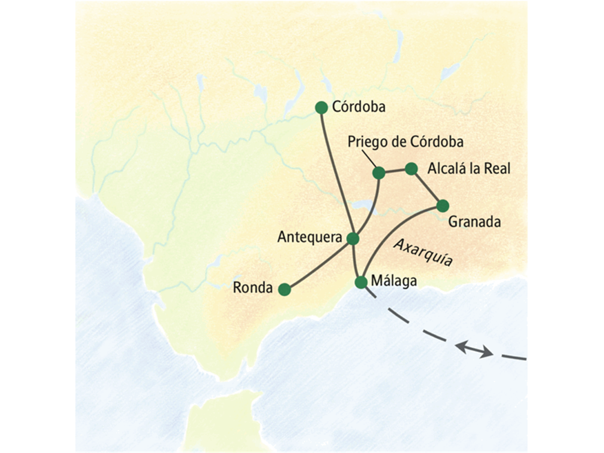 Wir fahren nach Priego de Córdoba, eine kleine barocke Schatzkiste inmitten der weiten andalusischen Landschaft mit Oliven- und Mandelhainen. Ein nicht weniger ursprüngliches Stück Andalusien erleben wir in Alcalá la Real: In einer Bodega probieren wir den Wein der Gegend, bevor wir Granada erreichen. Zwei Übernachtungen.